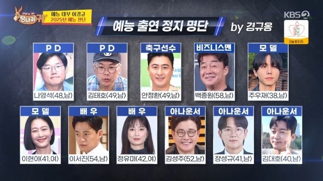 KBS2TV‘사장님귀는당나귀귀’캡처KBS2TV‘사장님귀는당나귀귀’캡처KBS2TV‘사장님귀는당나귀귀’캡처[뉴스엔서유나기자]코미디언이경규가직접작성한예능출연정지블랙리스트를발표했다.2월9일방송된KBS2TV예능'사장님귀는당나귀귀'(이하'당나귀귀')292회에서는박명수와신기루가2025년예능판도를읽고혜안을얻고자예능대부이경규를찾아갔다.이날이경규의영화사사무실에찾아간박명수는"한국예능계의살아있는전설로서2025년예능판도를읽고앞서나가야대상을받을수있지않겠냐"며분석과예측을부탁했다.박명수는이렇게까지걱정하는이유에대해본업이가수인이찬원이대상을받은'2024KBS연예대상'을언급했다.박명수는이뿐만아니라2023년MBC연예대상에서는웹툰작가인기안84가,2017년SBS연예대상에서는'미우새'어머님들이대상을수상했다며수상자체엔문제가없지만개그맨들의입지가줄어들어걱정이라고토로했다.이경규는"개그맨출신의예능인들은사실설자리가별로없다.이건심각한문제.웃음을공부했던사람들이다사라져버렸다.거기서부터우리는무너진것"이라고공감했다.최근예능에서는셰프,가수,배우,스포츠인,공무원,기업인,PD,댄서등다양한직군의활약상이늘어났다.이경규는"이친구들중에서도특히더위험군이있다.위험군들을박멸해야한다"며개그맨을위협하는직군1위로셰프를꼽았다."최고골칫덩어리"라고.하지만셰프들은아군으로나눌지적군으로나눌지에대해선심도있는논의가필요하다고밝혔다.이경규는박명수가백종원을예시로들자"백종원씨는요리사가아니라비즈니스맨이다.백종원은내후배다.프랜차이즈업게는내가먼저다.자빠지면김밥집이었다.지금40대들은내가만든김밥을먹고자라난어린이들"이라고불쑥주장했다.이어이경규는백종원은안고갈수없다며"내프로그램을뺏어가는데?'흑백요리사'등많은프로를해왔다.더이상이를그냥눈뜨고지켜볼수없다"며셰프는아군이지만백종원은적군이라고주장했다.이경규는즉석에서칠판에백종원의이름을적으며블랙리스트작성을시작했다."전쟁을선포한거다.참을수없으니이제막가자는것"이라고열변을토한이경규는다만백종원과의2MC섭외가들어오면안할거냐는질문에"한번들어왔었는데안했다.지금은하자고하면해야죠"라고답하며멋쩍게웃었다.이경규가두번째로언급한직군은PD였다."PD가왜MC를봐?"라며못마땅해한이경규는스타PD로김영희PD,김태호PD등이있지만"문제는나영석"이라고말했다.박명수는"'백상'(남자예능인상)을이경규가타야하는데나영석이받았다.어떻게생각하냐"고이간질했다.이에이경규는"PD만하라이거다.(예능)하면안된다.연출하고편집할시간도없는데어찌하여편집은다른사람시키고자기는출연만하느냐이거다.나영석은즉시'백상'을반납하라!제2의나영석이나오지않도록PD들은방송출연자제하라!"라고주장했다.이경규는무엇보다"스포츠인이최고로문제"라며"은퇴만하면예능으로온다"고토로했다.이경규는서장훈,안정환이하는프로그램만10개가넘는다며"얘들이다뺏어갔다고보면된다.재미는있는데코치나감독은왜안하냐.안정환선수도축구감독을하는데왜오락프로에서하냐는거다"고핏대를세워가며불만을드러냈다.이경규는오직자신의사위인축구선수김영찬의방송출연만을허락하며안정환을블랙리스트에포함시켰다.아나운서도적군으로판별됐다.이경규는"최고문제다.우리세계를다말아먹었다"며대표적문제아로전현무,김성주,장성규,김대호를꼽았다."얘네들이프로그램을40개나해처먹고있다"고거침없이소리친이경규는하지만곧전현무이름을뺐다.본인채널에출연했기때문이라고.이경규는사심을가득담아전현무는살려주기로했다.가수는확실하게아군이었으나배우는애매했다.요즘작품이없어예능으로많이넘어오는상황이었다.'삼시세끼','서진이네'등이예시로들어지자전현무는"다나영석PD프로네"라며공감했다.이경규는배우는인정하되항상경계하기로결정했다.다만이서진,정유미등주요배우는블랙리스트에리스트업했다.이때이경규는윤여정의이름도포함하려했지만박명수가"윤여정선배님아카데미상받았는데괜찮냐"고묻자빠르게지워웃음을안겼다.이경규는이번에작성한블랙리스트는출연정지명단이라며"실명을공개함으로써파란을일으키고싶다"고당차게주장했다.이경규는"우리가얘기했는데도불구하고방송에출연하면가택연금에들어가겠다"고밝혔다.일명'이경규의살생부'에는나영석,김태호,안정환,백종원,주우재,이현이,이서진,정유미,김성주,장성규,김대호총11명이포함됐다.이경규는블랙리스트에서제외되고싶다면자신의개인채널에출연하라는말을남겼다.뉴스엔서유나stranger77@기사제보및보도자료[email protected]ⓒ뉴스엔.무단전재&재배포금지Copyright©뉴스엔.무단전재및재배포금지.