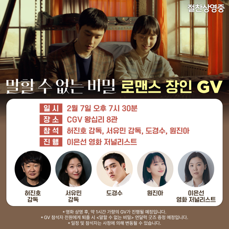 사진=플러스엠엔터테인먼트제공허진호감독이‘말할수없는비밀’지원사격에나선다.배급사플러스엠엔터테인먼트에따르면영화‘말할수없는비밀’은오는7일오후7시30분서울CGV왕십리에서‘로맨스장인GV(관객과의대화)’를개최한다.이자리에는‘말할수없는비밀’의서유민감독과배우도경수,원진아,그리고허진호감독이함께한다.네사람은이날GV에서‘말할수없는비밀’에대한다양한이야기를나눌예정이다.특히허진호감독은로맨스바이블로손꼽히는‘8월의크리스마스’,‘봄날은간다’등을탄생시킨명감독이자로맨스대가로그가들려줄영화관람후기에도기대감이쏠린다.한편GV에대한자세한사항은CGV홈페이지와모바일앱에서확인가능하다.장주연기자[email protected]©일간스포츠.무단전재및재배포금지.