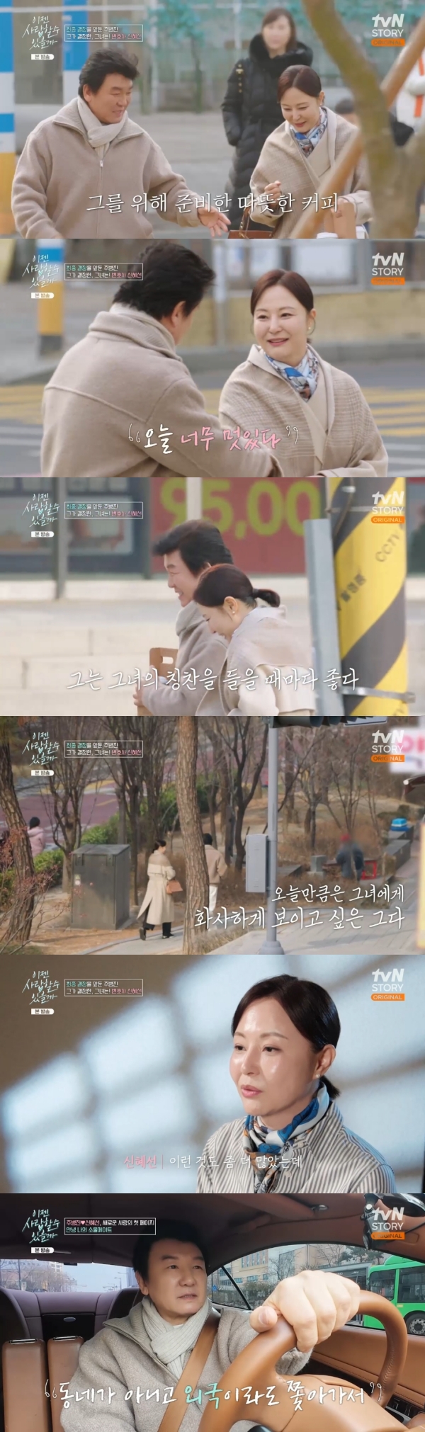 사진=tvNSTORY[스포츠투데이김태형기자]주병진이신혜선과새로운사랑의첫페이지를열었다.3일방송된tvNSTORY'이젠사랑할수있을까'에는주병진의마지막결정이그려졌다.이날주병진은두번째맞선녀였던변호사신혜선씨를선택했다.신혜선은"사실기대는반반하긴했었다.워낙얘기하는동안대화도많이통했다고저는생각했었고그래서살짝기대하는감이더있었다.애프터신청해주셔서감사하다"고말했다.주병진은"첫번째만남부터통하는부분이많았다.그리고신혜선씨가굉장히현명하다는생각이들었다"고선택의이유를밝혔다.횡단보도에서만난두사람은밝게웃으며인사를나눴다.신혜선은"너무멋있다"며주병진을칭찬했고,주병진은"오늘무리하게흰바지를입었다.화사하게보이려다보니까"라고말해웃음을자아냈다.신혜선은"오늘은더친해진것같다.사실첫번째는긴장감때문에많이떨렸고,두번째는좀더친해져야겠다는의무감이많았는데오늘은자연스럽게조금더친해진느낌이많이들었다"고밝혔다.동네까지와줘서고맙다는말에주병진은"동네가아니고외국이라도쫓아가서"라고직진하는모습을보였다.[스포츠투데이김태형기자[email protected]]Copyright©스포츠투데이.무단전재및재배포금지.