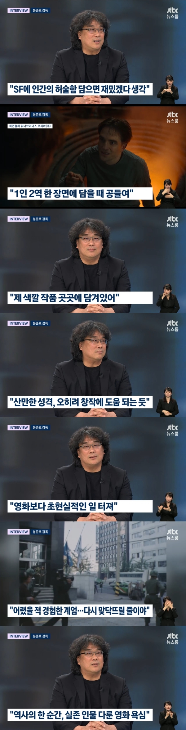 JTBC'뉴스룸'9일방송JTBCJTBC(서울=뉴스1)장아름기자=봉준호감독이지난해12월3일계엄령을접했을당시상황에대한생각을밝혔다.9일방송된JTBC'뉴스룸'의인터뷰코너에는신작'미키17'개봉을앞둔봉준호감독이출연했다.이날방송에서봉준호감독은어떤것에서작품의영향을받냐는질문에"제성격이산만하다"며"온전히상황에집중못하고다른이상한걸로신경의가지가뻗쳐가고다른생각을하는경우가많은데그게창작에는오히려도움이된다,곁가지로빠졌을때이상한아이디어를얻게되기도한다"고답했다.봉준호감독은"뉴스에서도영감을받냐"는질문에"그럼요"라며"뉴스나다큐멘터리에서아이디어영감얻는경우많다,'기생충'처럼영화에아예뉴스장면넣는것도좋아한다"고털어놨다.또한봉준호감독은"현실이영화보다더한데현시국에대한생각은어떠하냐"는질문에"그어떤SF영화보다도초현실적인일이터졌다"고운을뗐다.이어그는"제가초등학교4~5학년때가1979~1980년이었는데'서울의봄'에나오던시기였다"며"아련하지만계엄령에대한기억이있다,그후로40몇년의세월이흘렀는데그걸제생에서다시맞닥뜨릴수있을지상상도못했다,황당하면서어이없으면서충격적이었다"고고백했다.봉준호감독은이어"'미키17'배우들이나같이했던스태프분들도당황스러웠는지'괜찮냐,도대체어떻게된거냐,무슨일이냐'는등의문자와이메일이많더라"며"정말황당하다,BTS와블랙핑크,로제'아파트'가이번주는몇위야하다가계엄령이나오니까당혹스러운일이었다"고덧붙였다.봉준호감독은시대극에도관심이있냐는질문에"역사의어느한순간을다룬영화나실존인물다룬영화도해보고싶다"며"구체적계획은없지만그런욕심은있다"고도전했다.작품을만족하는기준에대해서는"새로운것""다른창작자에의해반복될수없는것"이라고밝혔다.'미키17'이만족스럽냐는질문에는"보시고얘기해주시면좋을것같다"고말해작품에대한기대감을높였다.한편'미키17'은위험한일에투입되는소모품(익스펜더블)으로,죽으면다시프린트되는'미키'가17번째죽음의위기를겪던중,그가죽은줄알고'미키18'이프린트되면서벌어지는예측불허의이야기를그리는영화다.봉준호감독이'기생충'(2019)으로칸영화제와아카데미시상식을석권한이후복귀작으로주목받고있다.오는28일국내에서전세계최초개봉한다[email protected]©뉴스1.Allrightsreserved.무단전재및재배포,AI학습이용금지.