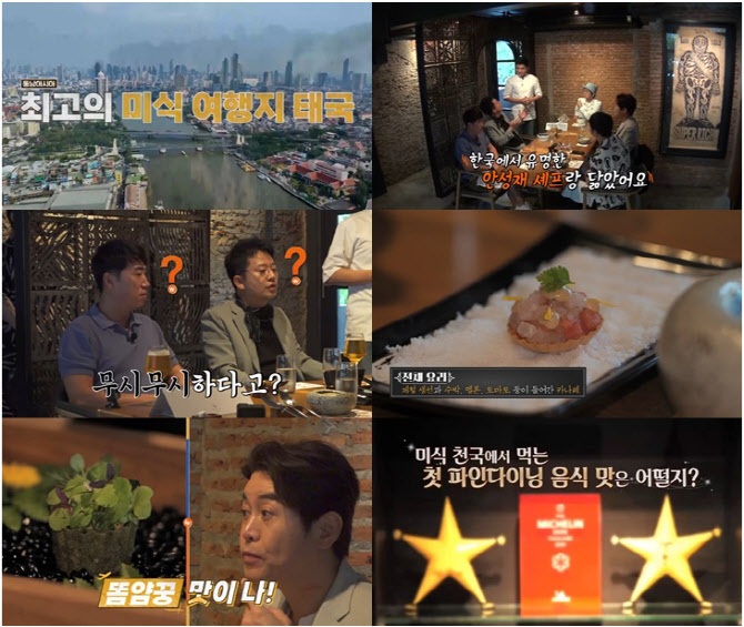 '독박투어3',8일오후8시20분방송[이데일리스타in김가영기자]‘독박즈’가태국방콕에서5성급숙소보다더비싼‘파인다이닝’을영접하는호사를누린다.8일방송하는‘니돈내산독박투어3’(채널S,SK브로드밴드,K·star,NXT공동제작)28회에서는태국방콕으로떠난김대희x김준호x장동민x유세윤x홍인규가한국의스타셰프안성재와도절친인톤(TON)셰프가운영하는‘미슐랭’레스토랑에서초호화‘파인다이닝’을맛보는현장이펼쳐진다.이날방콕의핫플인‘담넌사두억’수상시상에서즐거운시간을보낸‘독박즈’는방콕에서가장오래된사찰이자가장큰와불상이있는‘왓포’사원으로향한다.‘소원맛집’으로도유명한이사찰에서‘독박즈’는저마다가슴에품은소원을꺼낸다.사찰안에있는징을치면서소원을비는것은물론,20바트를지불한뒤108개의동전을받아사찰내에있는항아리에동전을집어넣으며소원을비는의식도참여하는것.이때유세윤은고등학생이된아들을언급하면서“우리아들이많이웃게해주세요”라고말하고,7월김지민과결혼을앞둔김준호는“무사히결혼할수있게해주세요”라며두손을모아핑크빛기류를풍긴다.이후‘독박즈’는지난이집트편‘최다독박자’인홍인규가벌칙으로예약한‘파인다이닝’레스토랑으로이동한다.홍인규는슬쩍멤버들의눈치를보더니,“사실‘미슐랭3스타’맛집을예약하려고했는데,너무비쌌다.그래서‘1스타’를예약했다.한번만봐달라”며읍소한다.장동민은“너죽고싶냐?”고버럭하고,이에홍인규는“우리‘독박투어’에서먹은식사비중가장최고가일것”이라며“한끼에120만원인데와인을추가하면150만원이넘는다”라고설명한다.이에‘독박즈’는입을떡벌리며‘미슐랭1스타’레스토랑에대한기대감을내뿜는다.식당에들어선이들은이곳의대표셰프인톤(TON)셰프와인사를나눈다.톤셰프는“한국의안성재셰프와닮았다”는‘독박즈’의말에“안성재와는친구사이다.5년전행사장에서만난뒤로친하게지내고있다”고답해반가움을안긴다.잠시뒤,태국각지에서생산한재료들로만든신선한전채요리가등장하고,‘독박즈’는고급진톤셰프의요리에감탄하며먹방에돌입한다.안성재셰프의절친이만든‘미슐랭1스타’파인다이닝의맛이어떠할지,홍인규를‘울상’으로만든최고급요리의향연에궁금증이치솟는다.태국방콕으로떠난‘독박즈’의여행기는8일(오늘)오후8시20분방송하는‘니돈내산독박투어3’28회에서만날수있다.김가영([email protected])Copyright©이데일리.무단전재및재배포금지.