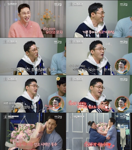 ‘오만추’황동주♥이영자애프터데이트현장(사진:KBS)'직진연하남'황동주가"연락을기다렸다"라는이영자의말에데이트약속을잡고'꽃을든남자'로깜짝변신했다.2일방송된KBSJOY,KBS2TV'오래된만남추구'(이하'오만추')에서는최종애프터선택이후황동주와이영자의전화통화현장이공개됐다.지난주황동주는'30년이상형'이영자와서로인연의촛불을밝히며다음만남을기약한바있다.이날구본승과김숙의애프터데이트에합석하게된황동주는최종선택이후이영자로부터문자를받고날아갈듯기뻐했던일화를공개했다.황동주는이영자의매니저를통해자신의연락처를전한뒤,하염없이기다릴수밖에없었다고밝혔다.그는"어느날촬영하고나와서핸드폰을봤더니문자가와있어서진짜깜짝놀랐다.'와!문자왔어!'라고소리를질렀다"라고전했다.또너무기분이좋아스탭들과소고기회식까지했다며"고깃값이너무많이나왔다"라고해맑게웃었다.그러나황동주는"유미언니한테공격적인문자한번보내봤냐"라는김숙의질문에"지금도조심스러운게크다"라며적극적으로다가갈수없었던속내를밝혔다.이에즉석에서이영자와의전화연결이이뤄졌다.이영자는"동주씨는나한테만나자는얘기한마디도안하고..."라며아쉬움을내비쳤다.김숙이"동주는언니를배려해서기다리고있었대"라고하자,이영자는"나도...연애꽝이잖아.내가뭘알아"라고고백했다.이렇게서로를기다리고있었다는사실을알게된뒤,맛있는냉면집을알고있다는이영자에게황동주는"같이가면좋을것같다"라며데이트를약속했다.그리고며칠후황동주는이영자를위해커다란꽃다발을한아름안고나타났고,이를본이영자는놀람과기쁨을감추지못했다.설렘이가득한두사람의본격애프터데이트현장은다음주'오만추'에서공개된다.'일편단심'황동주와'30년이상형'이영자의두근거리는애프터데이트가펼쳐질KBSJOY,KBS2TV'오래된만남추구'는매주일요일밤9시20분에방송된다.박지혜기자[email protected]뉴스연예팀기사제보[email protected]©bnt뉴스.무단전재,재배포및AI데이터활용금지