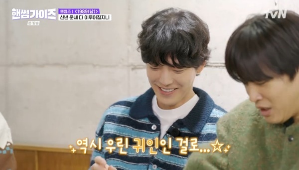 [OSEN=박하영기자]‘핸썸가이즈’김우빈이운세를확인했다.9일방송된tvN예능‘일요일엔핸썸가이즈’에서는지난주에이어최초로인물을주제로한‘뱀띠스타탐방빙고레이스’편이그려졌다.이날핸썸즈팀에는‘1989년1월부터전면자유화가된것은?’이라는문제가출제됐다.김동현은통금,두발자유화아니냐고추측했고,차태현은1989년도당시중학생1학년이었다며“그때머리밀었다.두발자유화아니다”라고말했다.김우빈도“저희도삭발이었다”라고했고,우상혁도“저도빡빡밀었다”고공감했다.반면차태현은해외여행자유화가아닐까추측했다.그는“그전에는진짜제한적이었던게허가를받아야나갈수있다고들었다.왠지88올림픽끝나고전면자유화가나오지않았을까”라고했고,김우빈은“해외여행맞는것같다.느낌왔다”라고확신했다.정답은해외여행자유화가맞았다.그렇게1989년(남)카드획득한핸썸즈팀.김우빈은바쁜스케줄로사주풀이대신포춘쿠키로운세를확인했다.그결과,‘귀인은함께하는것만으로도운이상승한다.당신의귀인은노란색을지니고있다.항상주변을잘둘러보세요’라고나왔고,멤버들은자신의옷을확인하며노란색을찾아나섰다.이때차태현은김우빈을위해사왔던에그타르트를꺼내며“죄다노란색이다.잘됐다”라며자칭귀인이라고칭해웃음을자아냈다.이후김동현과우상혁은김우빈에게사진을요청하며인증샷을찍으며추억을남겼다./mint1023/@osen.co.kr[사진]‘일요일엔핸썸가이즈’방송화면캡처Copyright©OSEN.무단전재및재배포금지.