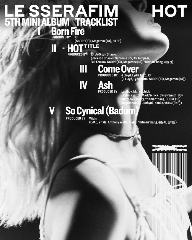사진=쏘스뮤직제공[뉴스엔이민지기자]르세라핌(LESSERAFIM)이사랑노래를부른다.3월4일쏘스뮤직공식채널에공개된르세라핌(김채원,사쿠라,허윤진,카즈하,홍은채)의미니5집‘HOT’트랙리스트에따르면,새앨범에는신보와동명의타이틀곡‘HOT’을포함해‘BornFire’,‘ComeOver’,‘Ash’,‘SoCynical(Badum)’등총다섯곡이수록된다.타이틀곡‘HOT’은록(Rock)과디스코(Disco)가가미된팝장르의음악이다.결말을알수없을지라도좋아하는것을위해모든것을불태우겠다는메시지를담았다.르세라핌은데뷔후처음으로타이틀곡에서사랑을노래한다.숀멘데스(ShawnMendes)와카밀라카베요(CamilaCabello)의‘Senorita’,방탄소년단의‘IDOL’등수많은명곡에참여한알리탐포시(AliTamposi),르세라핌의정규1집타이틀곡‘UNFORGIVEN(feat.NileRodgers)’으로합을맞춘펠리펠라로(FeliFerraro)가협업해곡의완성도를높였다.영국유명밴드정글(Jungle)의멤버조쉬로이드(JLloyd)와리디아키토(LydiaKitto)가세번째트랙‘ComeOver’작업에참여했다.협업소식만으로화제를모은가운데,정글만의빈티지하고몽환적인느낌을르세라핌의방식으로보여줄예정이다.또한앨범의포문을여는첫번째트랙‘BornFire’는지난달21일공개된트레일러에일부삽입되었다.특히이번앨범은멤버들의참여로눈길을끈다.허윤진은타이틀곡‘HOT’과수록곡‘Ash’,‘SoCynical(Badum)’까지총3곡의크레디트에이름을올렸다.마지막트랙‘SoCynical(Badum)’은김채원,홍은채도힘을더해자신들만의색을보여줄것으로기대된다.다채로운곡이수록된르세라핌의다섯번째미니앨범‘HOT’은3월14일오후1시발매된다.르세라핌은이번신보를통해사랑하는것에온마음을다하는태도를보여준다.오는7일신곡에대한더많은정보를전하는하이라이트메들리를공개하면서팬들의기대감을한껏고조시킬예정이다.뉴스엔이민지oing@기사제보및보도자료[email protected]ⓒ뉴스엔.무단전재&재배포금지Copyright©뉴스엔.무단전재및재배포금지.