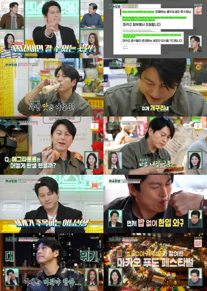 [스포츠조선백지은기자]류수영이신들린먹방을펼쳤다.21일방송된KBS2'신상출시편스토랑'(이하'편스토랑')에서는류수영이3번째해외출장지마카오로떠났다.앞서류수영은'편스토랑'과함께2번의해외출장에나섰다.미국스탠퍼드대학교에서한식강연과요리를선보였고,미네소타한국어마을을찾아한식의맛을알렸다.이날류수영은마카오관광청으로부터셰프로초청받아마카오에도착했다.마카오는'맛카오'라고불릴만큼세계각국의다양한식문화와요리를만끽할수있는미식의도시.요리는물론먹방에도일가견이있는'먹남선생'류수영은"요리연구!"를외치며마카오의화려한식문화를제대로즐겼다.1일차에무려마카오21식을즐기는류수영의먹방에시청자들도군침을삼켰다.먼저류수영은이른아침부터마카오현지인해장맛집을찾았다.이곳에서류수영은식전음료또우장(중국식두유)을시작으로한국인입맛에도딱맞는쏸라펀등현지의메뉴들을맛봤다.특히개구리등쉽게맛볼수없는특별한식재료에까지도전하며시청자들의호기심을충족시켰다.하지만류수영의먹방은시작일뿐이었다.류수영은볶음밥,연유뿌린꽃빵튀김,마카오대표디저트에그타르트와우유푸딩,마라곱창등을연달아흡입했다.류수영은단순히현지음식을먹는것에그치지않고음식의유래등다양한지식도전하며시청자가지루해할틈없이만들었다.그중에서도특히눈길을끈것은류수영이마카오요리대가로불리는유명셰프플로리타알베스의초청을받아,그녀의파인다이닝레스토랑을찾았을때였다.플로리타셰프는류수영을보자마자"스탠퍼드강연편정말훌륭했다"라고'편스토랑'과류수영을향한팬심을전했다.다시금'편스토랑'과K-푸드스타류수영의영향력이입증된것.이곳에서류수영은마카오요리퍼레이드에먹방고삐를제대로풀고말았다.'편스토랑'식구들모두VCR을보며"아침부터계속먹고있다"라고혀를내둘렀지만류수영은"요리를연구하는것"이라며끝없이폭풍흡입했다.그렇게하루종일먹고또먹은류수영.어느덧밤이찾아왔지만,류수영은또다른맛집을찾아길을나섰다.그러나예상밖위기가찾아왔다.12시간동안미식로드를즐긴탓에비워야만하는상황에처한것.류수영은"지금아니면큰일나"라며황급히자리를떠났고,잠시후다소핼쑥하지만상쾌한미소와함께컴백해폭소를유발했다.그리고현지디저트탕수이를또먹었다.류수영이이날하루만에맛본마카오메뉴는무려21종이었다.타고난먹방천재능력을입증한데이어,직접발품팔아만든마카오먹지도로시청자들의마카오미식여행욕구까지불태웠다.다음방송에서는류수영이전세계1000가지이상의음식이모이는'마카오푸드페스티벌'에참여,K-푸드를알리기위해고군분투할예정이다.백지은기자[email protected]©스포츠조선.무단전재및재배포금지.