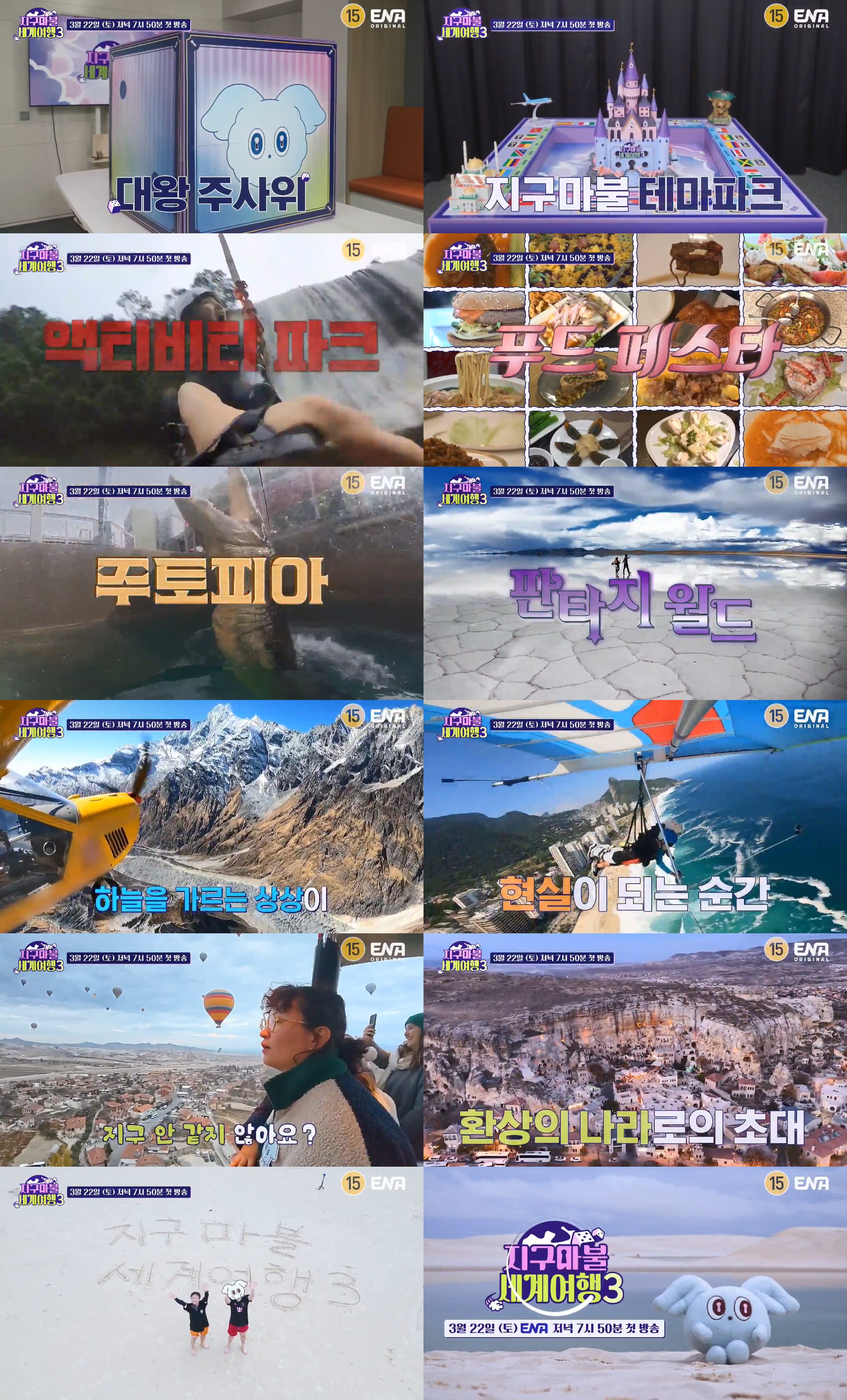 지구마불세계여행/사진=ENA지구마불세계여행[스포츠투데이백지연기자]‘지구마불세계여행3’이오는3월22일(토)저녁7시50분첫방송확정을알리며,3배더재미있어진시즌3의첫티저영상(https://youtu.be/dM3s00byzRY)을공개했다.ENA와TEO의예능프로젝트‘지구마불세계여행3’(이하‘지구마불3’)은여행크리에이터3대장빠니보틀(빠니보틀PaniBottle),원지(원지의하루),곽튜브(곽튜브KWAKTUBE)가김태호PD가설계한세계여행부루마불게임에참여해주사위에운명을맡기며세계각지를여행하는과정을담은예능프로그램이다.지난시즌1,2가주사위를굴려즉시떠나는여행이라는독특한컨셉으로독보적신선함을선사하며뜨거운사랑을받은가운데,더커진스케일과차별화된테마로돌아온시즌3에관심이집중된다.이와관련공개된1차티저영상은“시즌1,2와너무다른것아니에요?”라는‘곽빠원’의놀란리액션으로시작된다.이어등장한대왕주사위가열리자,마치거대한테마파크를연상케하는신상보드판이등장한다.‘지구마불테마파크’는시즌3의핵심컨셉으로,다양한테마아래더욱업그레이드된스케일,색다른볼거리,익스트림한즐거움을예고한다.그첫번째테마는‘액티비티파크’.폭포번지점프,설산패러글라이딩,디스코팡팡을방불케하는지프차오프로드투어등자연그자체가어트랙션이되어‘곽빠원’은물론시청자들에게도손에땀을쥐게하는스릴을선사할예정이다.곽튜브의심장은물론눈도뒤집어지고,액티비티중독자빠니보틀도200%만족한걸보니,벌써부터그짜릿한재미를예감케한다.두번째테마는‘푸드페스타’로,100년노포맛집부터초호화레스토랑체험까지세계각국의다채로운요리를즐길수있는월드푸드페스타가열린다.씹고뜯고맛보며입안가득퍼지는다양한음식들의풍미를만끽한‘곽빠원’의미식탐험이군침을돌게한다.이밖에도다양한동물들을바로눈앞에서만나볼수있는‘주토피아’,지구안에존재하지않는것같은풍경에감탄이절로나오는‘판타지월드’가시청자들을환상적인세계로초대할전망이다.그안엔무엇을‘환상’하든,그이상의‘환장’할재미도기다리고있다.‘곽빠원’과함께할특별한여행파트너들도빼놓을수없는기대포인트다.지난시즌2에서신현지,박준형,김용명,공명,강기영,원진아,김도훈이‘곽빠원’과폭발적인케미를자아내며다채로운재미를선사한바.이번‘지구마불3’에서는‘곽빠원’도역대급반응을뿜어냈다는특별한여행파트너가등장한다.제작진은“이전시즌보다더큰스케일의더짜릿한여행이오는3월22일시작된다.전세계를테마파크삼아펼쳐질‘곽빠원’의스펙터클한여정을함께해달라.무엇보다시즌3에는‘곽빠원’도,시청자도예상치못했던여행파트너들이함께한다.새로운케미와재미가넘치는이들의낭만여행기를기대해달라”고덧붙였다.‘지구마불세계여행3’은ENA에서오는3월22일토요일저녁7시50분에첫방송된다.[스포츠투데이백지연기자[email protected]]Copyright©스포츠투데이.무단전재및재배포금지.
