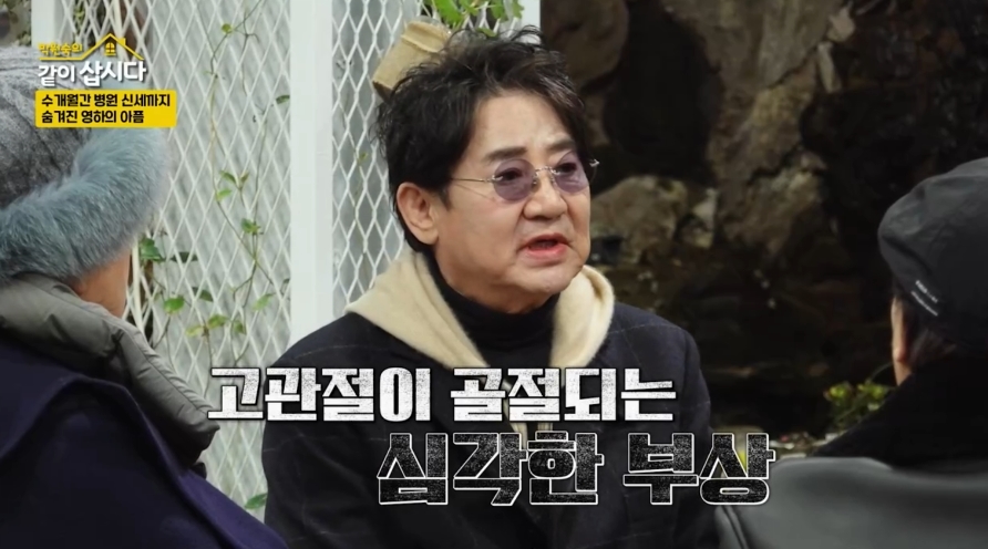 (엑스포츠뉴스정민경기자)이영하가과거추락사고를언급했다.27일오후8시30분방송된KBS2TV'박원숙의같이삽시다'에는이영하,윤다훈이함께해진솔한대화를나눴다.이날이영하는뮤지컬도중겪었던아찔했던추락사고의경험을털어놨다.대화중박원숙은"이영하씨는여행하고그럴때고관절때문에아프고힘들었다는얘기를들었다"고운을띄웠다.10여년전,뮤지컬에도전한이영하는무대장치실수로추락하는사고를당했다.당시고관절이골절되는심각한부상을입었다고.이영하는"고관절에인공관절을넣었다"며"수술후에도몇개월을움직이지못했다"며오랫동안병원신세를져야했다고발했다.그러면서"고관절때문에힘든게,여행을가면공항검색대를통과할때(인공관절이라)소리가울려펴진다.창피하다"며뜻밖의고충을털어놔웃음을자아내기도.한편이날이영하는며느리를향한애정을내비쳐눈길을끌었다.그는"나는세상살이첫번째기준이'많이웃자'인데,며느리가정말잘웃는다"며"정말업어주고싶을정도로잘웃고긍정적이다.화내는걸못봤다"며남다른며느리사랑을드러냈다.한편이영하는지난1981년10살연하동료배우선우은숙과결혼했으나2007년이혼했다.사진=KBS2TV정민경기자[email protected]©엑스포츠뉴스.무단전재및재배포금지.