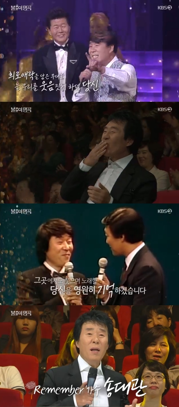 티브이데일리포토[티브이데일리김진석기자]'불후의명곡'제작진이세상을떠난트로트가수故송대관을추모했다.8일방송된KBS2예능프로그램'불후의명곡'에선송대관을추모하는영상이공개됐다.이날방송말미에는송대관이과거출연했던'불후의명곡'영상과그의출연분등을편집한영상이이어졌다.자막으론'친근한목소리로58년간모두의친구가되어준국민트로트가수송대관'이라는문구가이어졌고,'희로애락을담은무대로늘우리를웃음짓게하던당신.그곳에서도웃으며노래할당신을영원히기억하겠습니다'라며고인을추모했다.송대관은지난7일오전심장마비로세상을떠났다.향년79세.이에더해'전국노래자랑'측은고인이생전초대가수로출연했던방송분을그대로공개하기로했다.이번무대는고인의마지막무대가될전망이다.트로트계레전드송대관은지난1967년'인정많은아저씨'로가요계데뷔했으며,1975년발표한'해뜰날'이대중적인기를얻으며전성기를맞았다.이후'정때문에''차표한장''큰소리뻥뻥''고향이남쪽이랬지''네박자''유행가'등히트곡을다수만들어내며국민가수반열에등극했다.[티브이데일리김진석기자[email protected]/사진=KBS2'불후의명곡']불후의명곡|송대관[Copyrightⓒ*세계속에新한류를*연예전문온라인미디어티브이데일리(www.tvdaily.co.kr)/무단전재및재배포금지]Copyright©티브이데일리.무단전재및재배포금지.