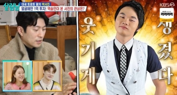 사진=KBS2'살림남'[스포츠한국김현희기자]박서진이관상풀이를하던중굴욕을맛봤다.22일오후방송된KBS2'살림하는남자들시즌2'(이하'살림남')에는박서진이박효정과함께역술인을집으로초대한모습이방송됐다.이날역술가박성준은"두분의생년월일을미리받았다.일단박서진님은근본적으로욕구불만으로태어났다"며"욕망이강해서욕구불만으로태어났다.성격이굉장히급하고욱하는게있을수있고,분노,원망과한이쌓여있는게많다"고말해놀라움을자아냈다.또한박서진사주에대해"태생이잡혀있는걸싫어하고늘벗어나려고한다.반면동생은안전하게잡아야하는일복많은얼굴이다"며"박서진님은잡혀살아야할성향이다.여자가야무지고,주도권을가지고서진을쥐락펴락할수있는이성이좋다.본인이내여자한테굉장히잘해주고아껴주고따뜻함을줄수있는그런기질이없게태어났다"고얘기해웃음을자아냈다.사진=KBS2'살림남'이어"혹시고친데가있나요?성형수술하면그사람의관상이바뀌어서볼수가없다.성형하면인상이바뀐다.관상은아니다"라고했다.이를들은박효정이서진의과거사진을역술인에게보여줬다.이를본박성준역술가는"일단얼굴이웃기게생겼다.또자유분방하다.이목구비의각부위가따로노는느낌이다"라고해폭소케했다.이를들은박서진은굴욕을맛보게됐다.'살림남'은매주토요일오후9시15분에방송한다.스포츠한국김현희기자[email protected]©스포츠한국.무단전재및재배포금지.