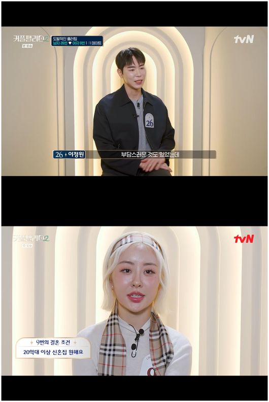 [OSEN=오세진기자]‘커플팰리스2’26번남성출연자와9번여성출연자의미묘한호기심이발생했다.5일방영한tv’N커플팰리스2’에서는서로를30초안에판단하고선택하는스피드트레인이이틀연속치러졌다.남성출연자소개당시26번188cm키의변호사와변리사두개의자격증을보유한남성출연자가등장하자9번여성출연자는픽을했다.그러나남성출연자는다른여성을선택했고,다음날여성출연자가등장하자유심히보고있다가매력을느껴선택해매칭이됐다.여성9번은결혼조건이확고했다.'신혼집20억원'이었다.여자9번은“사랑이다가아니라고생각한다.웬만한사람은성에안찬다.처음만난남자친구가준비해온신혼집이20억원이었다.몇년전이었다.그정도이하로는눈에안찬다”라고말했다.남성26번은자신의능력을믿고26번여성을택했고,여성은다양한질문을쉴새없이쏟아냈다.남성26번은“아이컨택을정말잘하더라.한국사람같지않았다”라면서“대화를하는데잡아먹힐거같았다”라며솔직하게말했다.그러면서도그는설렘을느꼈고,“이마음이끝까지갔으면좋겠다”라고밝혔다./[email protected][사진]‘커플팰리스2’Copyright©OSEN.무단전재및재배포금지.