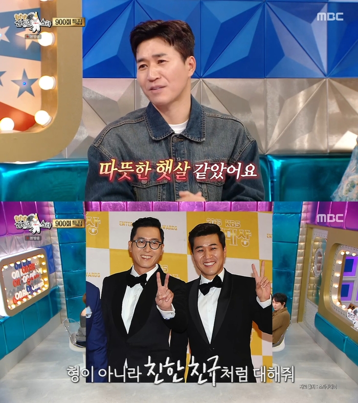 ‘라디오스타’.사진IMBC‘라디오스타’방송캡처그룹코요태김종민이배우고(故)김주혁을추억했다.5일방송된MBC‘라디오스타’에는김종민,문세윤,박나래,코드쿤스트가게스트로출연했다.이날김종민은18년간함께한‘1박2일’에대해“막내로시작해서지금은제일큰형이다.이번에회식하는데출연자,스태프통틀어서내가제일나이가많더라.깜짝놀랐다”고말했다.김종민은‘1박2일’원년멤버로서각기수비교에도나섰다.김종민은“1기는처음이다보니여행가는느낌이었다.2기는다말술이었다.방송보다술이더힘들었다.촬영전날부터술을마셨다.다음날술병이나서쓰러진적도있다”고회상했다.이어“3기는큰형이고김주혁이었다.따뜻한햇살같았다.‘편하게해라.난네형이아니다.친한친구처럼했으면좋겠다’고했다.굉장히따뜻한사람이었다”고추억했다.그러면서“4기는내가큰형이다.뭔가를해야겠다는생각에부담이됐다.초반에하려고하는데애들이하는걸보니열받더라.내가형인데말을잘안듣는것같았다.그때나는큰형이될상이아니라는걸깨닫고동생들에게맡겼다.다내려두니형처럼대해줬다”고했다.한편‘라디오스타’는매주수요일오후10시30분방송된다.[이세빈스타투데이객원기자]Copyright©스타투데이.무단전재,재배포및AI학습이용금지