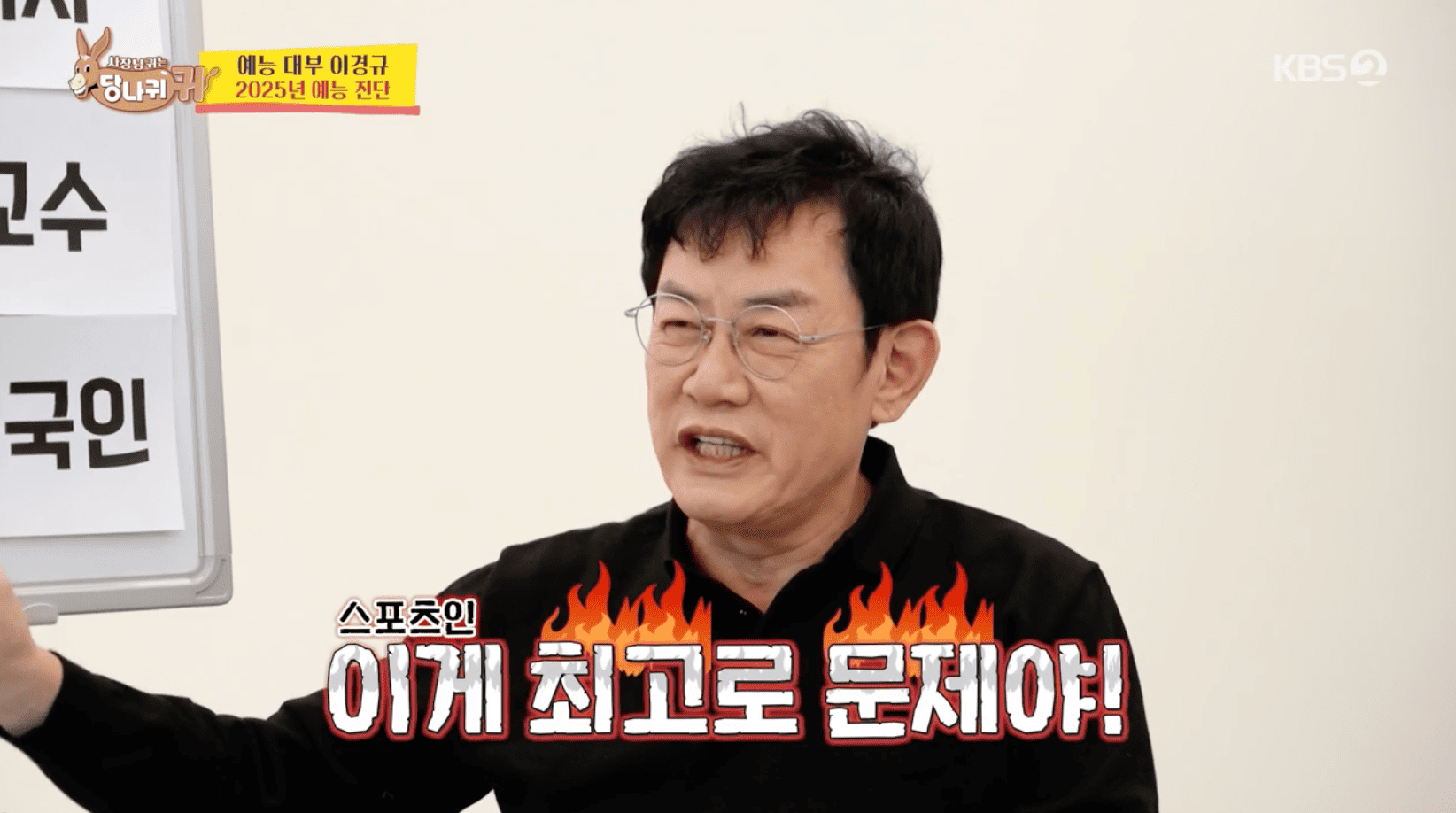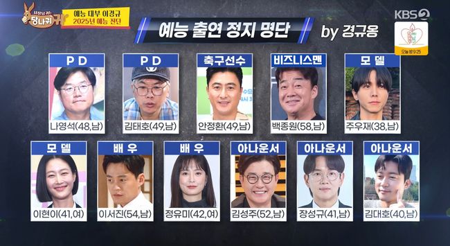 [OSEN=장우영기자]‘사장님귀는당나귀귀’이경규가예능출연블랙리스트11인을공개했다.9일방송된KBS2‘사장님귀는당나귀귀’에서는신종철총주방장,박명수,엄지인등보스들의모습이그려졌다.새해첫스페셜MC로이경규가‘사장님귀는당나귀귀’를찾아왔다.이경규는“정말나오고싶었다”며영화감독으로서프로그램에함께하고싶다는뜻을밝혔다.이경규는“내가최적의보스다.직원들의입이엄청나와있다.직원이80여명이다”라고말했고,부드러워졌다는전현무의말에“요즘많이바뀌었다.녹화가길어져도아무말안한다”고말했다.이가운데엄지인은전현무에대해“김진웅,이광엽,홍주연이밖에서따로만났다”고폭로했다.박명수와이경규는“남자두명은희생양이다.홍주연을빼내기위해병풍으로세웠다”고지적했고,“사실혼이사실이었다”,“애도있다고한다”고말해웃음을자아냈다.특히3월결혼설에휩싸인바있는전현무는‘뷔페의신’신종철이근무하는호텔에서상견례를하는게어떠냐는추천을받았다.전현무는“하다하다3월결혼설은뭐냐.엄마가연락을하더니‘3월에결혼하냐’고하더라.츄도‘축하한다’고연락이오더라.너무사실이아닌게많다”고하소연했고,이에박명수가“그럼5월에하자”고하자“좋다”라고했다가“그러면5월로정정했다고또기사가나온다”고말했다.엄지인은홍주연과정은혜,허유원에게숙직매뉴얼을알려줬다.특히정은혜,허유원은숙직이처음이라수중계(뉴스를라디오로듣는청취자들을위해9시뉴스와동시송출되는라디오뉴스)에대해알려주며통역,직함,이름등우선순위를설명했다.설명후홍주연이시범을보였다가혼나자전현무는“네가위축을시키지않냐”며홍주연을감싸열애설에박차를가했다.숙직업무중수중계를맡은홍주연은실수없이마무리했고,허유원과정은혜도라디오뉴스를깔끔하게마쳤다.엄지인은후배아나운서들의주차연습을도와준다며차량검사를하기도했다.홍주연의차는1년전긁은부분이아직도그대로였고,내부에서는속옷이발견되는듯했지만자외선차단용복면이었다.면허를취득한지얼마안된정은혜와허유원은해매다가꾸중을들었고,홍주연은극악난이도의평행주차를시도하다실패했다.박명수는신기루와함께이경규를만났다.박명수는“한국예능계의살아있는전설로서새로운예능판도를읽고혜안을얻고자한다”고조언을구했다.먼저‘2024KBS연예대상’을통해개그맨들의입지가줄어든것같다는박명수의말에이경규는“개그맨출신예능인은설자리가없다는게심각하다.웃음을공부한사람의자리가사라졌다.거기서개그맨시대가무너졌다”며“여러직종에서예능에진출하는데이친구들중에서도위험군이있다.이들을박멸해야한다”고주장했다.이경규는셰프를최고골칫덩어리라고주장하며“동지로함께하기엔심도있는논의가필요하다”고말했다.박명수는의식주와관련된이들은품고가야한다고말했고,신기루는이들의예능진출을반대했다.이경규는백종원에대해“요리사가아닌사업가다.내후배다.프랜차이즈업계는내가먼저다.안을수는없다.내프로그램을뺏어간다.이를눈뜨고지켜볼수는없다”며셰프는아군,백종원은적군으로규정했다.PD의예능진출에대해선“밑도끝도없다.PD가왜MC를보냐.쌀집아저씨김영희PD가PD중에서는나댔던PD다.고의적으로유명해지려고작정했다.스타PD1호는김영희PD이고,그다음은김태호PD인데자진출연이아닌떠밀려서나온사람이다.문제는나영석PD다.PD면PD만해야한다.연출하고편집할시간도없는데어찌하여자기는출연만하느냐이거다.나영석은즉시백상을완납(반납)하라”고강조했다.특히이경규는PD들의예능출연금지법안을발의해야한다고덧붙여웃음을줬다.스포츠인에대해선“최고로문제다.은퇴만하면예능으로온다.서장훈,안정환이하는프로그램이합쳐서19개다.안정환도축구감독을하는데왜예능에서하느냐”고목소리를높였다.이에박명수가“예능인인데왜영화감독을하냐”고하자이경규는“내돈으로하지않냐.나는내가투자받아서내가제작한다.안정환은자기돈으로출연료주고그러냐.그러니까축구감독해야한다”고핏대를세웠다.하지만이경규는곧바로자신의사위를생각하며“은퇴하면예능하라”고말을바꿔웃음을자아냈다.가수,기업인들은동지라고품은이경규는기안84등웹툰작가에대해서는“강제진압해서들어내야한다.우리는현장에서웃기지않으면날아간다.웹툰작가들은우리보다훨씬유리한측면이있다.웹툰만했으면한다.방송하려면웹툰정리하라”고말했다.프로파일러,헬스트레이너등에대해서는경계심을낮춘이경규는전현무,김성주,장성규,김대호등아나운서출신이예능생태계교란종이라고주장했다.배우들은인정하되항시경계해야한다고말했다.이경규는실명공개로“파란을일으키고싶다”며블랙리스트에대해출연정지를강하게주장했다.이와함께이경규는연애프로그램이트렌드라고분석했다.이경규는“삶자체를프로그램을만드는건그런시대에와있는그자체가안타깝다.예능포맷개발없이비슷한류의프로그램으로돌려막는다는뜻이다”라고짚으면서도자신도그러한프로그램에출연하겠다는뜻을내비쳐웃음을자아냈다.이후이경규는‘사당귀’스튜디오에서