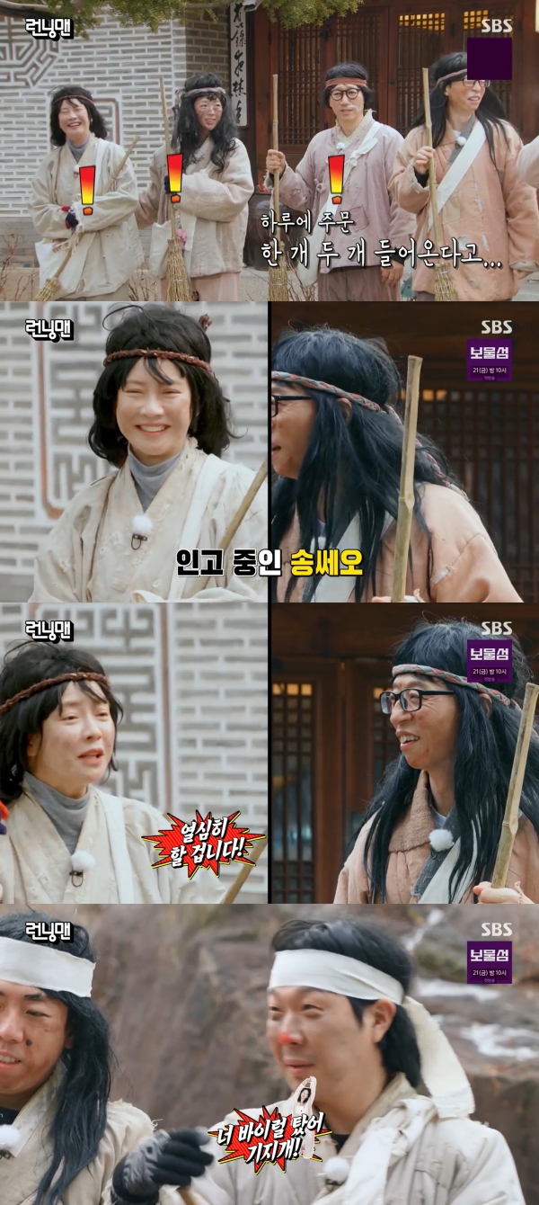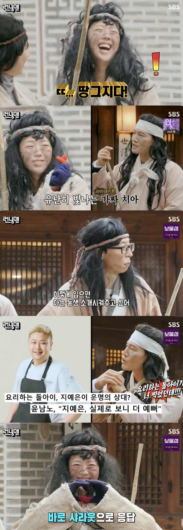 [스타뉴스|정은채기자]/사진='런닝맨'방송화면캡쳐'런닝맨'에서지예은이'요리하는돌아이'윤남노셰프에샤라웃으로응답했다.9일방송된SBS'런닝맨'에서는노비가된멤버들이대감님이말한심부름을위해서울곧곧의심부름장소에방문하는레이스가펼쳐졌다.이날멤버들은제작진의사전지시에따라노비로변신한채오프닝장소에등장했다.그러나노비보다는거지에가까운행색.모든걸내려놓은분장에실성한듯웃는지예은을향해유재석은"오늘너너무예쁘다.아는동생소개해주고싶다"라고짓궂은장난을쳤다.그러나지예은은"저요즘인기많더라"라고너스레를떨었다.이를들은하하는넷플릭스예능프로그램'흑백요리사:요리계급전쟁'에출연해화제가된요리하는돌아이가한방송에서지예은의미모를언급한걸꺼냈다.이번에도지예은은멤버들의장난에말리지않고"요리하는돌아이고마워!"라며샤라웃을보내현장을웃음바다로만들었다.정은채기자[email protected]©스타뉴스&starnewskorea.com,무단전재및재배포금지