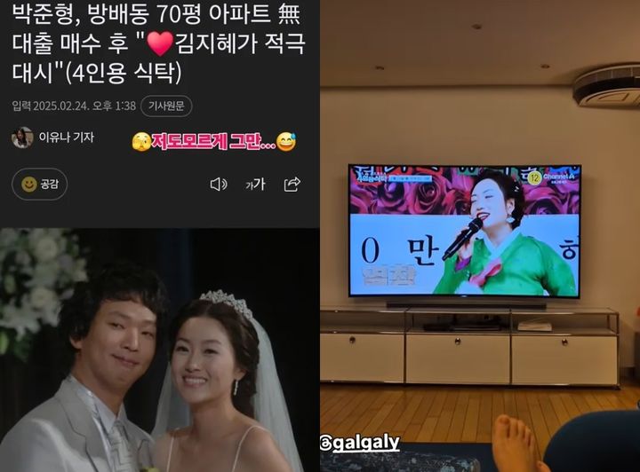 [서울=뉴시스]코미디언김지혜가남편박준형의외모를디스했다.(사진=인스타그램)*재판매및DB금지코미디언김지혜가남편박준형의외모를디스했다.25일김지혜는인스타그램에'박준형,방배동70평아파트무대출매수후김지혜가적극대시'라는제목의기사캡처한사진을올리고"저도모르게그만"이라고적었다.이어"확실한건외모는안본듯.사춘기딸을둔엄마로서딸들에게많이미안"이라면서도"아니다매력이다.외모는만들어지는것"이라고덧붙였다.함께공개된영상에서김지혜는전날남편박준형이채널A예능프로그램'절친토큐멘터리4인용식탁'에출연한방송을모니터링하는모습이다.[서울=뉴시스]코미디언박준형이아내김지혜와의러브스토리를공개했다.(사진=채널A예능프로그램'절친토큐멘터리4인용식탁')*재판매및DB금지이날방송에서박준형은김지혜와의러브스토리를공개했다.그는"김숙,김지혜,김미진등여자동료들이미래신랑감투표를했다.외모,장래성,개그실력,자산규모로점수를매겼는데내가1등이었다.그뒤부터나를보는김지혜의눈빛이예사롭지가않았다"고주장했다.당시주택청약을넣어방배동70평짜리아파트에당첨됐다는박준형은"코피를흘려가며돈을엄청나게모아서대출없이아파트를샀다.그소문이난순간김지혜에게전화가왔다.전화가매일오다가어느날'자기혼자산다'고하더라"며"믿기어렵겠지만김지혜가날엄청나게따라다녔다.(김지혜가)결혼해달라고우리집앞에서3시간동안울기도했다"고말했다.박준형은김지혜에게먼저이별통보를한사연도털어놨다.그는"내가김지혜를발로뻥찬적도있다.'너를담기엔내그릇이너무작다.너를놓아주겠다.이제우리그만헤어지자'고했다.그런데김지혜가내가출연하는라디오에'그남자를다시만나고싶어요'라는내용의사연을보냈다"고회상했다.이를듣던코미디언정경미가"그게김지혜인걸어떻게알았냐"고지적하자,박준형은"연애당시'헛똑똑이'라고불렀는데,사연첫줄이'저는헛똑똑이입니다'였다"고답했다.그러면서"내가사연을읽고있는데당시게스트가김구라형이었다.구라형이사연을보더니'남자가여자한테학을뗀것'이라고하더라.(김지혜가)나한테잘보이려고하는모습이귀여웠다"며이별을극복하고결혼에성공했다고밝혔다.특히박준형은자신의외모에자신감을보이기도했다.정경미가"아직도본인이잘생겼다고생각하냐"고묻자,박준형은"솔직히괜찮다.키185.5cm에100kg에육박하는듬직한몸"이라고말했다.한편김지혜와박준형부부는2005년결혼해슬하에두딸을두고있다.이들부부는서울서초구반포동에위치한90평대한강뷰아파트에거주중이다.해당아파트실거래가는60억원대인것으로알려졌다.황소정인턴기자([email protected])Copyright©뉴시스.무단전재및재배포금지.