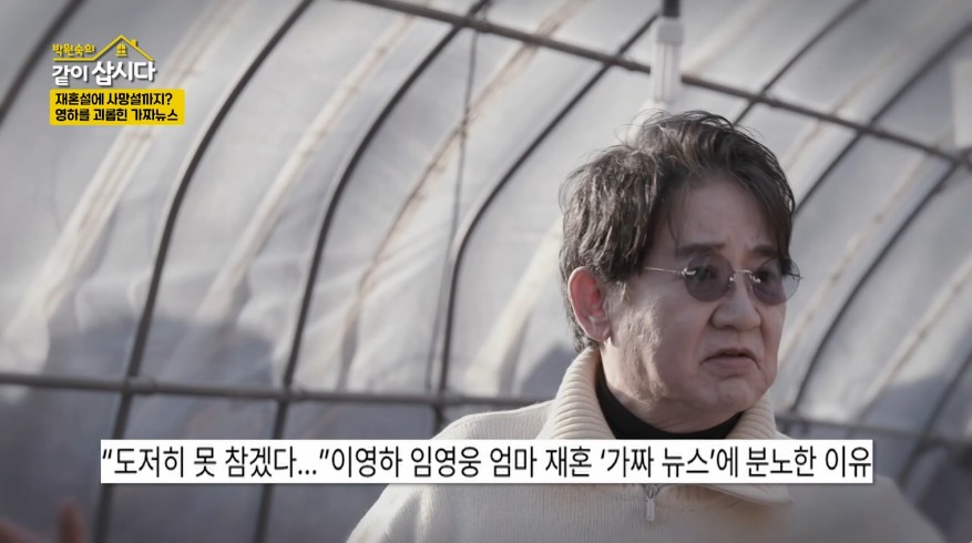 ▲출처|KBS2'박원숙의같이삽시다'[스포티비뉴스=김현록기자]배우이영하가자신이가수임영웅의모친과결혼했다는터무니없는가짜뉴스에진저리를쳤다.6일방송된KBS2'박원숙의같이삽시다'에서는배우이영하,윤다훈이출연해박원숙혜은이와즐거운시간을보냈다.이날혜은이와이영하가캠핑장에서쓰기위해약수터에서물을받아왔고,약수를즐기던윤다훈은"등산객이그모습보고또'이영하,혜은이둘이캠핑왔다'이러는건아니겠지?"라며농담을섞어가짜뉴스를토로했다.알고보니이영하는캠핑장으로오기전자신을둘러싼가짜뉴스로고통받고있다고토로했다.이영하는"가짜뉴스에,위독하다,병원에갔다,둘아가셨다…"라며진저리를쳤다.가짜뉴스피해자는이영하뿐이아니었다.박원숙은혜은이를가리키며"쟤는몇번죽어봤다"고고개를저었다.혜은이또한"저많이죽었다"며되려태연한모습을보였다.이영하를괴롭힌가장터무니없는가짜뉴스는임영웅모친과의재혼설.이영하는자신이임영웅의어머니와결혼했다는가짜뉴스가돌았던일을언급하며"대한민국에서지금제일유명한가수엄마와이영하가결혼을했다(고한다),거기에다영상까지만들어서,결혼식장에손잡고입장하고,어떻게묘하게만든다"고했다.그는"가짜가진실인것처럼만든다.정말너무싫다"고털어놨다.▲출처|KBS2'박원숙의같이삽시다'▲출처|KBS2'박원숙의같이삽시다'한편이영하와선우은숙은1981년결혼해26년만인2007년이혼했다.슬하에는두아들이있다.<저작권자ⓒSPOTVNEWS.무단전재및재배포금지>Copyright©스포티비뉴스.무단전재및재배포금지.