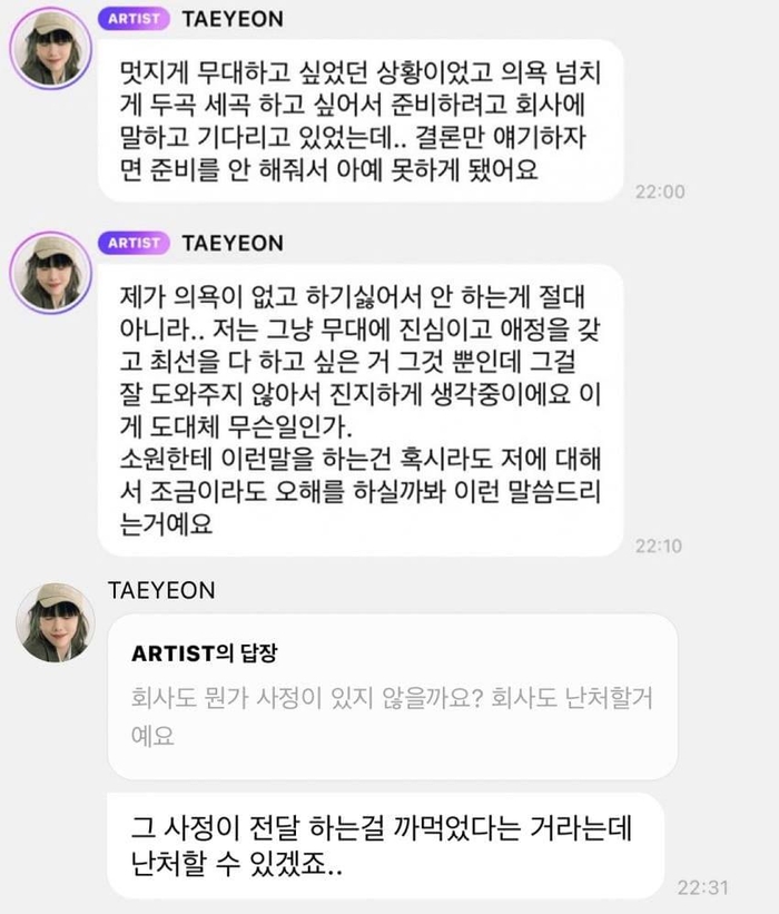 소녀시대태연이팬소통플랫폼을통해‘에스엠타운라이브2025인서울’에불참하는것과관련해SM에불만을표출했다.온라인커뮤니티캡처그룹소녀시대태연과레드벨벳의웬디가소속사를향해토로한불만이일파만파번지고있다.태연은지난6일팬소통플랫폼을통해SM엔터테인먼트합동콘서트‘에스엠타운라이브2025인서울’에불참하는것과관련해,“멋지게무대하고싶었던상황이었고의욕넘치게두곡세곡하고싶어회사에말하고기다렸다.결론만얘기하자면준비를안해줘서아예못하게됐다”며SM저격발언을전했다.오는11일과12일서울고척스카이돔에서진행되는‘에스엠타운라이브2025인서울’은처음공개한라인업을통해태연등SM소속가수의출연을예고했으나,지난달티켓예매처를통해‘소녀시대태연은출연하지않는다.출연진변경으로불편을드린점양해말씀드린다’고공지했다.수수료없이예매취소및환불을보장한다고알렸지만,팬들은갑작스러운불참에우려와분노를표했다.소녀시대태연.SM엔터테인먼트태연은이어“제가의욕이없고하기싫어서안하는게절대아니다”라며“무대에진심이고애정을갖고최선을다하고싶은것뿐인데,그걸도와주지않아진지하게생각중이다.이게도대체무슨일인가”라고다시금강조했다.또일부팬이‘회사도뭔가사정이있지않겠나.회사도난처할것’이라고하자,“그사정이전달하는걸까먹었다는건데,난처할수있겠죠”라고SM비난에쐐기를박았다.이에더해웬디까지공연을5일앞두고불참을알린것과관련해“회사랑얘기는한달도전에된건데공지가오늘에서야올라갔다”고밝혀SM을향한팬들의분노를키웠다.레드벨벳웬디.SM엔터테인먼트특히태연과레드벨벳측의SM을향한불만토로는처음이아닌만큼,팬들사이극단적추측까지이어지고있다.태연은앞서2019년솔로곡‘불티’의뮤직비디오가예정시간보다늦게공개된다는SM측의공지에‘하하하’라며당혹스러운심정을표한적이있다.레드벨벳의조이역시지난해데뷔10주년앨범‘코스믹’공개당시신곡의뮤직비디오시청리액션콘텐츠를올려달라는팬의요청에“글쎄,우리의견을아예들어주지않고기다리라고만하더니수정된부분이하나도없는뮤직비디오를봐서”라며공개적으로불만을표출했다.레드벨벳.SM엔터테인먼트조이는신보공개에앞서도“언제까지비밀인건지,아니면깜빡하고알리지못한건지,아니면다음주에발표하려고그러는건지나도의문”이라며,회사측의프로모션이소홀하다는의견을내비치기도했다.이에각팬덤은SM의무성의한업무처리와아티스트에대한처우를개선하라며트럭시위를진행하기도했다.그가운데이번논란이더해지면서팬들은비난의목소리를높이고있다.무엇보다레드벨벳팬덤에서는2023년부터불거져온재계약문제가해결되지않은것을두고‘웬디의불참은재계약불발때문아니냐’는의견까지나오는상황이다.레드벨벳은지난2014년데뷔해일명‘마의7년’을넘겨활동중이나,전원재계약소식은여전히전해지지않고있다.팬들이가슴을졸였던가운데,슬기와아이린이각각2023년과지난해에재계약소식을알렸으나,조이와웬디,예리의재계약은여전히나오지않고있다.김원희기자[email protected]©스포츠경향.무단전재및재배포금지.