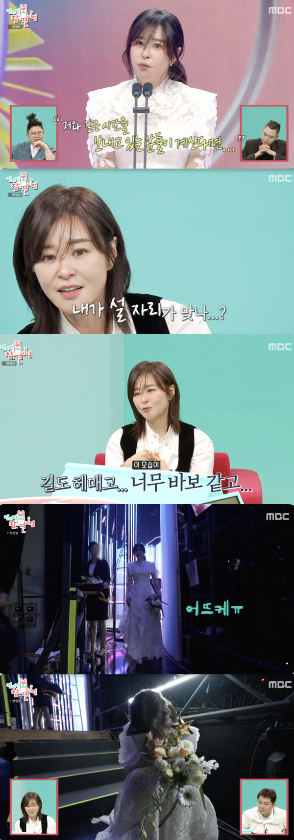 [스타뉴스|정은채기자]/사진='전지적참견시점'방송화면캡쳐배우최강희가신인상수상후무대뒤에주저앉아오열했다.8일방송된MBC예능프로그램'전지적참견시점'333회에서는배우최강희의'2024MBC방송연예대상'신인상수상비하인드스토리가공개됐다.30년만에MBC시상식에참가한다고밝힌최강희는이중턱관리를위해곡기를끊는건물론시상식당일에는촉촉한피부를위해비싼장미수토너와아이크림을얼굴에잔뜩발라피부를관리에나섰다.소속사대표송은이와함께차를타고시상식장에이동하던중최강희는"너무웃기다.언니랑여기까지오는과정이다꿈같다"라며감개무량한모습을보였다.이에송은이가2년전연말에는뭘했는지묻자"(2023년연말에는방송을쉬고)봉사다니고있었다.그래서행복하게살았다"라고답했다.그러면서"그러고서방송복귀한다고생각하니까겁나더라.그런데사람들이너무따뜻하게대해줬다"라며방송복귀를환영해준시청자들에게고마운마음을드러냈다.또"작년이내일생일대에가장행복했던시간이었다.재밌는꿈같다"라고덧붙였다.이어두사람은신기루,이국희,샵뚱(홍현희메이크업아티스트)의대기실을찾았다.세사람은대기실에서육회,육사시미,잡채,꼬치전,애호박전,떡만둣국,갈비찜까지거한한상을차려식사중이었다.최강희가진기한광경에놀라자신기루는"원래'연예대상'은다이렇게먹는다.이게풍토다.'연기대상'에서안먹냐"라고오히려반문했다.이에최강희가"화장지워지고옷에묻을까봐안먹는다"라고하자신기루는도통이해할수없다는표정을지어현장을웃음바다로만들었다.한편최강희가'MBC2025연예대상'에서신인상을수상한장면이다시VCR에등장하자최강희는"또눈물나네.사실울었는지아닌지도기억이안난다.너무긴장해서다음말이생각이안났다다음말을겨우끄집어내서말했다"라고고백했다.스튜디오에서이를지켜보던또다른참견인마술사이은결은"(연기대상에서)드라마'나'로처음상받지않았냐.이번상은정말'나'로받은느낌이다"라며최강희의수상을축하했다.이어진장면에서는최강희가떨리는수상소감을마치고무대뒤로가주저앉아또다시오열하는모습이포착됐다.이에최강희는"그자리가나한테무서운자리인데(떨면서수상소감을제대로)잘못한것같았다.아무생각도안났다.길도헤매고내가너무바보같아서'내가여기설자리가맞나?'하는생각이들었다"라며눈물의이유를밝혔다.정은채기자[email protected]©스타뉴스&starnewskorea.com,무단전재및재배포금지