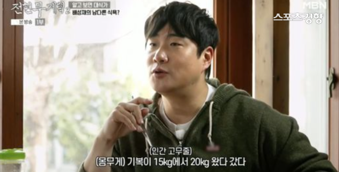 MBN·채널S예능‘전현무계획2’아나운서배성재가다이어트에대한고충을털어놨다.7일방송된MBN·채널S예능‘전현무계획2’에는배성재가게스트로출연했다.이날전현무곽준빈배성제는여의도의수제빗집을찾았다.식사하던중전현무는“배성재가인간적인게면이있다.볼때마다얼굴이달라져있다”고이야기했다.그러면서“언제는확빠져있고,언제는이종격투기선수처럼되어있다”고덧붙였다.이에배성재는“기복이15kg에서20kg까지왔다갔다한다.형도방송끝나고집에가면밤에엄청당기지않냐”고물었다.전현무는공감하며“밤에집에가면제일위험한시간이11시다.그때만넘기면살이빠진다.그때깨어있으면냉장고앞에문을열고넋놓는날발견한다”고했다.배성재역시“난양문형냉장고열고45도각도로몸을기대어보고있다.냉장고식재료들은내가무서울거다.고민하면서먹을까말까한다”고말해웃음을자아냈다.한편,배성재는SBS아나운서김다영과오는5월백년가약을맺는다.장정윤온라인기자[email protected]©스포츠경향.무단전재및재배포금지.