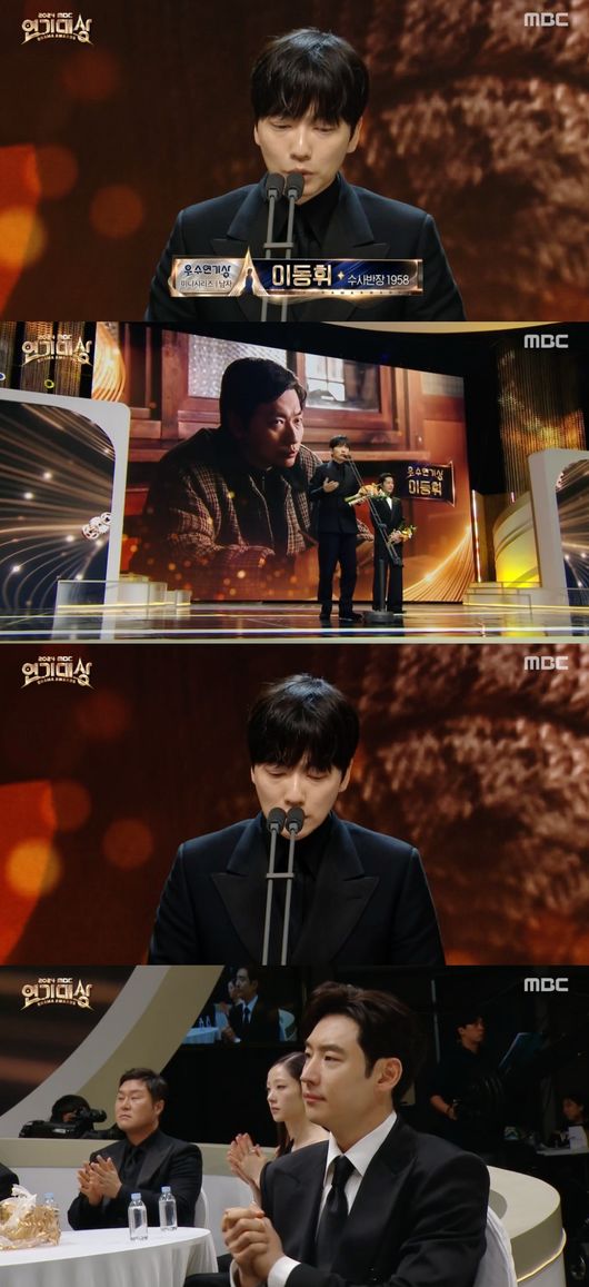[스포츠조선김소희기자]배우이동휘,이종원이'MBC연기대상'에서우수연기상을수상했다.5일방송된'2024MBC연기대상(이하MBC연기대상)'에서'수사반장1958'이동휘,'밤에피는꽃'이종원이미니시리즈부문우수연기상트로피를안았다.먼저이동휘는"슬픈상황속기쁨을온전히즐기기참어렵다.참석하신모든분들이여기오실때마음이무거우셨을것같은데"라며무안공항제주항공여객기참사를언급했다.이어그는"그런가운데,작품을만들어주신모든분들의노고를말씀드려야할것같다.'수사반장'이라는드라마를다시만들게해준우리최불암선배님등많은선배님들께감사드린다"며제작진들과선배연기자에게고마움을전했다.그러면서소속사대표이자배우인이제훈에게"진심으로너무많은것을배웠다.단한순간도그힘든상황속에도어려움없이끈기있게작품을끌어나가고있는모습을보고많은것을배웠다"라며고마움을전했다.마지막으로그는"힘든상황을겪고계실모든분들에게제가배우로서큰위로와용기와힘이될수있도록,그런배우가되도록여러분에게약속드리겠다"라고인사했다.다음으로이종원은드라마제작진들과가족들에게감사인사를전하면서"위로가필요하신분들에게제가할수있는건위로의말을전달하는것밖에없는것같다.이말로도조금이라도위로가됐다면저는그걸로도감사해하며행복하게살겠다"라고전했다.한편,'MBC연기대상'후보에는'밤에피는꽃'이하늬,'원더풀월드'김남주,'수사반장1958'의이제훈,'우리,집'의김희선,'백설공주에게죽음을-BlackOut'의변요한,'이토록친밀한배신자'의한석규,'지금거신전화는'의유연석등7인이올랐다.김소희기자[email protected]©스포츠조선.무단전재및재배포금지.
