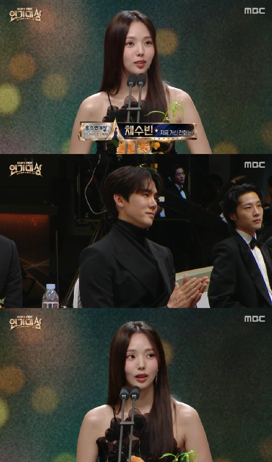 [스타뉴스|김나연기자]채수빈/사진=MBC연기대상'지금거신전화는'의배우채수빈이'MBC연기대상'우수연기상을수상했다.5일'2024MBC연기대상'이녹화방송됐다.'MBC연기대상'은당초지난달30일생방송으로진행될예정이었지만,개최하루전발생한제주항공여객기사고여파로취소된바있다.이날우수연기상미니시리즈부문여자수상자는'지금거신전화는'의채수빈이차지했다.채수빈은"이런자리에오기전에가슴아픈소식을들어서진심으로마음이아프고,마음깊이애도를표한다"고운을뗐다.이어"제가어릴때부터연기를꿈꿨는데TV를보면서배우들이이삶도겪어보고,저삶도겪어보는게너무멋져보였다.작품하나하나가저에게는선물같이느껴졌는데이선물이나한테만국한된게아니라누군가에게는위로와행복,기쁨이될수있다는게값지다감사한일인것같다.'지금거신전화는'속가슴아픈사랑이야기를경험해볼수있게해주셔서감사하고,이렇게예쁜이야기그려주신작가님,감독님등스태프분들감사하다"라고밝혔다.그는"함께연기한우리배우선배,동료분들정말고맙다.특히연석오빠는현장에서'유대장'이라고부르면서많이따랐는데현장에서많이이끌어주고도와줘서고맙단말하고싶다"고말했다.또한"이번작품에서수어를배웠다"며"드라마희주역을통해서여러분을만나서행복했습니다.사랑해주셔서감사합니다"를수어를통해선보여눈길을끌었다.김나연기자[email protected]©스타뉴스&starnewskorea.com,무단전재및재배포금지
