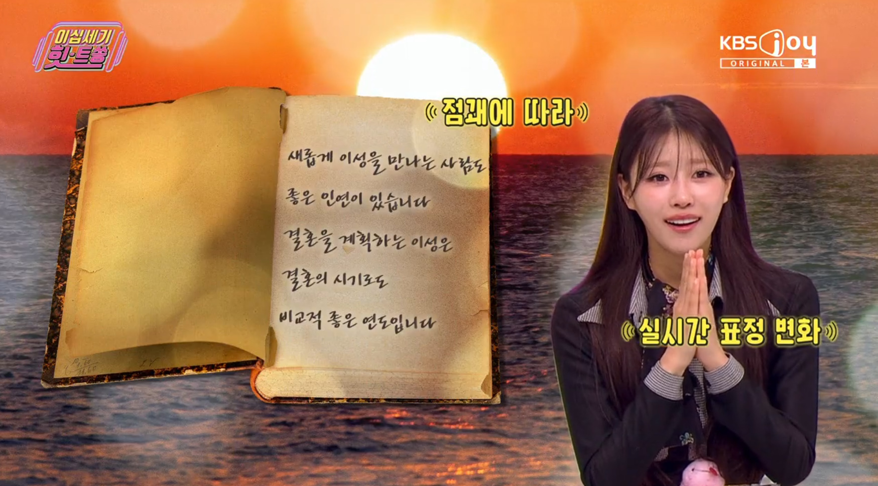 (엑스포츠뉴스윤현지기자)이미주가신년운세에서결혼운을발견했다.3일방송된KBSJoy'이십세기힛-트쏭'에서이미주는"토정비결을준비했다"라며두사람의신년운세를공개했다.먼저김희철의운세는"인연을이루고결실을보는연도다.연인들은결혼하기에아주좋은연도이니계획이있다면가급적올해를넘기지마라"라고나왔다.이미주역시"올해인생에있어중요한사람을만나게되고그사람으로인해큰빛을보게된다"라며"새롭게이성을만나는사람도좋은인연이있다.결혼을계획하는이성은결혼의시기로도비교적좋은연도"라는운세를받았다.이에이미주는"나결혼하겠네"라고했고,김희철은"우리둘이결혼하는거아니냐"라며꺄르륵웃었다.그러면서이미주가"나다음주에향수뿌리고올게"라고하자김희철도"나머리바로커트한다.나이제클럽안간다"라며맞장구를쳤다.사진=KBSJoy윤현지기자[email protected]©엑스포츠뉴스.무단전재및재배포금지.