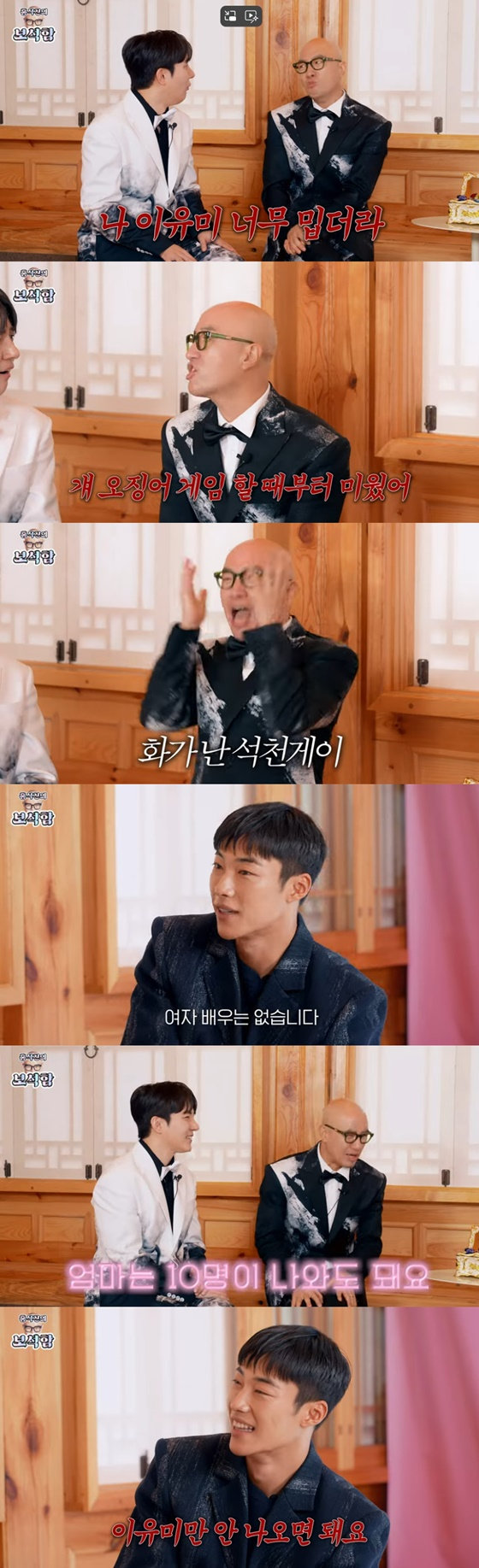 [스타뉴스|최혜진기자]/사진=유튜브홍석천의보석함배우홍석천이이유미에게질투심을드러냈다.지난28일유튜브채널'홍석천의보석함'에는'푸른뱀눈의해우도환'이라는제목의영상이올라왔다.영상에는배우우도환이게스트로출연했다.홍석천은우도환의외모를칭찬했다.그는"너무너무섹시하다.실제로보니까더섹시하다.눈도섹시하고코도섹시한데,내가봤을때가장섹시한부분은입술"이라고말했다.우도환은외모리즈시절에대해언급했다.그는"지금이리즈아닌가싶다.관리도하고대중앞에서는일을하다보니지금이가장리즈인시기가아닐까싶다"고전했다.또한우도환의필모그래피에대한이야기도나눴다.홍석천은우도환의필모중눈에들어온작품으로넷플릭스시리즈'Mr.플랑크톤'을꼽았다.그러면서"그거진짜키스신이있더라"고했다.홍석천은'Mr.플랑크톤'에서우도환과키스신호흡을맞췄던이유미에대해"나이유미너무밉다.나걔'오징어게임'할때부터미웠어"라면서"정말부럽더라"고말했다.또한우도환은최근'사냥개들'시즌2를촬영하고있다고밝혔다.우도환은해당작품에대해"키스신은없다.여배우없다.엄마만나온다"고설명했다.이를들은홍석천은"엄마는10명나와도된다.이유미만안나오면된다"고받아쳤다.최혜진기자[email protected]©스타뉴스&starnewskorea.com,무단전재및재배포금지