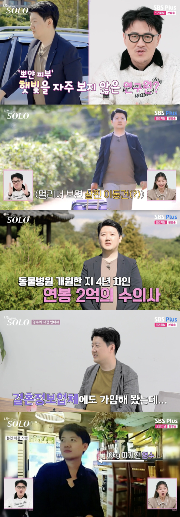 [스타뉴스|정은채기자]/사진='나는솔로'방송화면캡쳐'나는SOLO'(나는솔로)24기영수가솔로나라에입성했다.25일방송된ENA,SBSPlus'나는SOLO'에서는'솔로나라24번지'가시작됐다.24기는누구보다스마트하지만사랑앞에서만큼은서툰너드남들이'영원한내짝'을찾는'너드남특집'으로진행됐다.가장먼저영수가'솔로나라'에입성했다.MC송해나는영수의첫인상을보고"진짜너드다.피부가굉장히하얀거보면집에굉장히많이있는사람"이라고추측했다.데프콘은영수의큰키와또렷한이목구비를언급하며데프콘은"살찐이동건느낌이있다"라고거들었다.영수는동물병원을개원한지4년차된수의사로현재연봉이2억원이라밝혔다.이어진사전인터뷰장면에서남PD가출연계기를묻자그는"결혼정보업체에도가입해봤는데서로조건을많이보더라.저는아직설레는연애를하고싶은마음이있다"라고털어놨다.이상형을묻는질문에는"부부의연을맺어도제가외벌이로먹여살릴수있으니까직업은상관없다"라면서도"상대의외모는보는편이다.고양이상을선호한다"고밝혔다.정은채기자[email protected]©스타뉴스&starnewskorea.com,무단전재및재배포금지