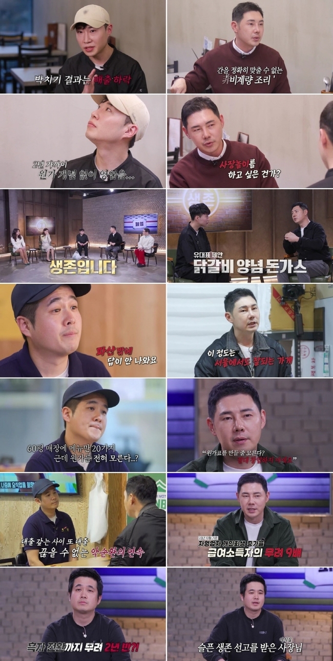 SBSPlus‘사장은아무나하나’캡처[뉴스엔김명미기자]SBSPlus‘사장은아무나하나'가역대시사교양프로그램중최고성적을거두는기염을토했다.2월4일방송한SBSPlus‘사장은아무나하나’4회에서는3MC한혜진-유정수-김호영과‘법벤져스’이경민-김혜진변호사가스튜디오에자리한가운데,무단침입-묻지마테러-방화등손놈들의각종만행을담은제보영상이공개돼충격을안겼다.또한유정수의‘비즈니스솔루션’코너에서는춘천의일식돈가스집과전주의야식집사장이‘SOS’를보냈는데,두사장모두‘원가관리’에무지함을드러내“원가표를못만들면창업할생각을하지말라”는유정수의따끔한일침을받았다.그러나유정수는각기다른이유로‘생존’선고를한뒤,맞춤솔루션을제시해주며두사장의새로운출발을응원해줬다.이날방송은시청자들의뜨거운관심이쏟아진결과,평균시청률0.6%(닐슨코리아전국기준)를기록했으며분당최고시청률은0.94%(이하수도권유료방송기준)까지치솟았다.타겟시청률역시평균0.4%,분당최고0.7%로,동시간대교양프로그램중타겟시청률2위에등극했다.동시에,SBSPlus가제작한역대시사교양프로그램중최고시청률을경신하는쾌거를거뒀다.이로써‘사장은아무나하나’는그것이알고싶다’,‘꼬리에꼬리를무는이야기’를잇는SBS미디어그룹의시사교양프로그램으로그존재감을확실히알렸다.화제성면에서도압도적인성과를보였다.‘웨이브시사교양TOP10’에서8위(2월5일오전기준),‘다음시사교양tv검색어TOP10’에서10위(2월5일오전기준)에올랐으며,각종포털사이트‘가장많이본뉴스’톱10을‘올킬’했다.먼저첫번째주인공으로강원도춘천에서일식돈가스가게를하는사장이등장했다.“6년동안게임BJ생활을한뒤,팬에게창업비용을빌려개업했다”는사장은“일매출이1/5로떨어져원인을알고싶다”고출연이유를밝혔다.해당가게를찾은유정수는‘비계량조리’를하는사장의모습에‘허세’라고지적하며“레시피북이없는것같은데?”라고추측했는데,사장은“일부있다”며“레시피가휴대폰속‘나와의채팅’에저장돼있다”고답했다.이에한혜진은“‘나와의채팅’창은남자친구와싸운뒤,화가나서장문의메시지보내기전에일단꾹참고임시저장하는곳인데,대부분그렇게이용하지않나?”라며황당해했다.사장은주로독학으로레시피없이요리를해왔고,“원가표를달라”는유정수의요청에도“원가표자체가생소하다”며난감해했다.결국가게손익계산서를직접작성한유정수는“인건비가매출의55%인데,12평규모의가게에서네명이나일하는것은비효율적”이라고짚었다.이어그는“회사가존속해야직원도챙길수있는건데,사장놀이를하고싶은건가?”라고꼬집었으며,김혜진변호사는“‘이태원클라쓰’드라마를열심히보신것같다”고덧붙였다.유정수는“박서준이여러인생망치고있다”며일침을날렸다.이후유정수는스튜디오에서‘폐업vs생존’을결정하기위해사장과재회했고,사장은처음으로직접정리한원가표와레시피북을보여준뒤,“주말피크타임아르바이트를제외하고직원들을정리했다”며개선의지를보였다.이에유정수는프로그램최초로‘생존’결정을내렸으며,“인건비절감으로흑자전환의희망을봤다.결정적으로(음식이)맛있었다”고말했다.또한촬영이끝난후유정수는“우리회사를방문해‘닭갈비돈가스’를같이개발하자”고제안한뒤,사장에게‘신메뉴레시피’를선물해감동을더했다.다음주인공인전주야식집사장은“60평의대형업장에월최고매출이1억원이지만,통장에남은돈이단9원으로,남은선택지는‘사채’뿐”이라며파산위기임을고백했다.원인을파악하기위해업장을방문한유정수는포스기를확인한뒤“매출이굉장히안정적이라,이정도면서울에서도잘되는가게”라고진단했다.주력메뉴를맛본뒤에도“가성비로봤을때추천할만하다”라며합격점을줬다.그러나“양이너무많아서남는게있을까?”라는유정수의말에,야식집사장마저도“원가계산을못해봤다”라고고백해또한번탄식을자아냈다.유정수는“장사를할때는너무나피곤한상태라,자영업도중원가관리를배우는건불가능하다.따라서원가표작성은꼭창업전에배워야한다”고재차강조했다.손익계산서를면밀하게점검한끝에유정수가발견한사장의아킬레스건은‘대출’이었다.5년전피자가게를폐업하며1억원의빚을진사장은무일푼으로대출을받아야식집을창업했는데,최종적으로파악된사장의총대출액은2억1400만원이었다.이로인해순이익이740만원가량이었음에도매달158만원의적자가났던것.여기에“가족에게매달500만원의생활비를주느라추가대출을받았고,직원들에게도대출을받아보너스를줬다”는사장의말에유정수는“매출이높다보니금방갚을수있다고생각했던것같다.‘매출만능주의’가낳은대출돌려막기의비극”이라고쓴소리를했다.스튜디오에서야식집사장과다시마주한유정수는‘폐업or생존’중“생존을택했지만,가장슬픈생존”이라며씁쓸해했다.유정수는“현매출에서순이익으로돌아서려면매출이잘유지된다는전제하에2년반이걸린다.파산이라는선택지가사회적비용이드는무책임한행동이라는판단하에생존선고를내린것이니부디이를악물고빚에서탈출