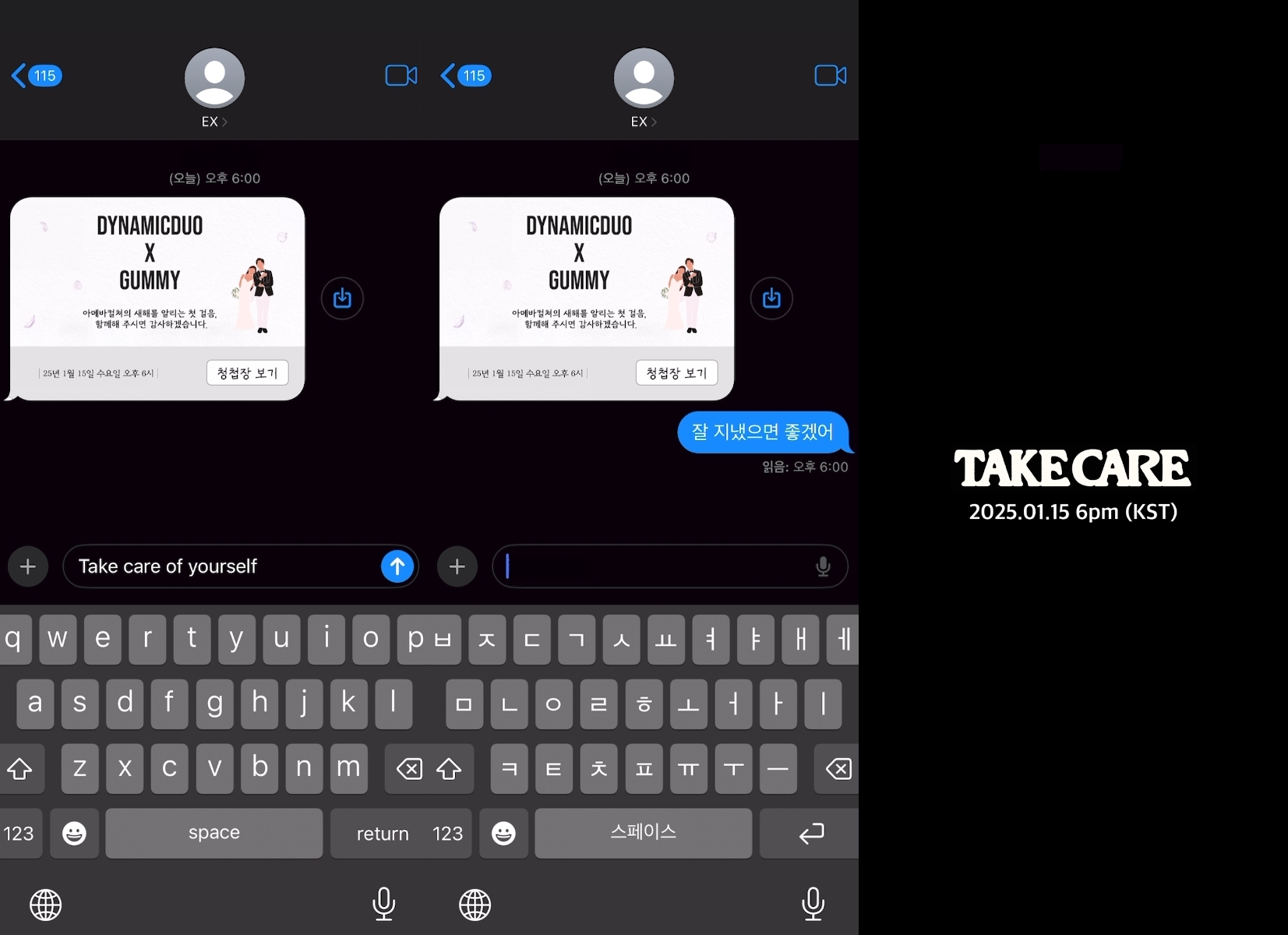 다이나믹듀오와가수거미가직접작사한‘TakeCare’의가사를스포일러했다.iMBC연예뉴스사진다이나믹듀오(개코,최자)와거미는지난12일소속사아메바컬쳐공식SNS와유튜브채널에첫번째컬래버레이션싱글‘TakeCare(테이크케어)’의가사스포일러티저영상을공개했다.‘TakeCare’는담담히서로의안녕과행복을빌어주는이별노래다.개코,최자와거미는직접작사한진정성있는가사와함께조화로운케미스트리를선보일예정이다.이날공개된티저는전연인이보낸청첩장에답장을보내는휴대폰화면을비췄다.“Takecareofyourself”라는텍스트를입력하던주인공은이내이를지우고“잘지냈으면좋겠어”라는메시지를전송했다.이를통해다이나믹듀오와거미는‘TakeCare’의성숙한이별감성을예고했다.상대를향한그리움,미련과더불어행복하길바라는진심을노래하는다이나믹듀오와거미의설득력있는보이스가리스너들의취향을저격할전망이다.‘죽일놈(Guilty)’,‘거기서거기(WithoutYou)’등현실적인이별이야기로리스너들의공감을이끌어온다이나믹듀오,‘친구라도될걸그랬어’,‘기억상실’등애절한발라드로눈물샘을자극해온거미는특급시너지로이번‘TakeCare’를완성한다.세사람의‘미친조합’이만들어낼완성도높은이별송에기대가증폭된다.다이나믹듀오와거미의첫컬래버레이션신곡‘TakeCare’는오는15일오후6시각종온라인음원사이트를통해발매된다.iMBC연예김경희|사진출처아메바컬쳐Copyright©MBC연예.무단전재및재배포,AI학습금지.