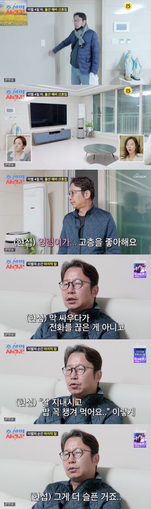 [OSEN=임혜영기자]심현섭이정영림과이별후홀로예비신혼집을찾았다.6일방송된TVCHOSUN극사실주의다큐예능‘조선의사랑꾼’에서는심현섭의이별과정이그려졌다.심현섭은정영림과갈등은있었지만여전히연애중이라고밝혔다.심현섭은"만난지10개월째다.앞으로도예쁜사랑키워나가겠다.가짜뉴스로둘이더똘똘뭉치고,예비부부로더강해졌다”라며결혼상상만으로도행복한모습을보였다.심현섭은올해봄으로결혼생각을하고있다고덧붙이기도.그러나며칠후심현섭은정영림과이별을했다며제작진에게알렸다.소속사대표는“어제저녁에영림이가여기까지인것같다고했다더라”라며안타까운소식을전했다.심현섭은“주말에행사가있으면2주만에본적도있고.말도안되는가짜뉴스까지나오니까.영림이가상황적으로지친것같다.남녀의일에대해얘기를지금다못하는것같다”라고상황을설명했다.최근가짜뉴스로인해정영림의어머니가쓰러질뿐만아니라친척들은평범한사람을만나라며반대까지했다고.심현섭은“그런영림이를제가케어를잘못해줬다.영림이가대쪽같고단호한게매력이라고생각한다.막상느껴보니좀더잘할걸,많이후회가된다”라고반성했다.심현섭은정영림과이별후4일째연락두절상태라며울산행을택했다.이를보던김지민은“좋은방법이다.저도싸우고지방에내려가서일주일간연락을안했다.찾아오니까마지못해풀리더라.연락자체가짜증나는데막상(얼굴을)보니까풀린다”라고공감했다.심현섭은정영림과의결혼을위해약두달전,울산에신혼집도구해놨었다.심현섭은“영림이가수업을많이하니까기관지때문에(공기청정기를놨다).영림이가고층을좋아한다”라고집구석구석을살폈다.냉장고에는정영림이가져다준반찬도있었다.심현섭은정영림과하루하루연락이안될수록두려움이커진다고밝혔다.심현섭은“막싸우다가끊은게아니고‘좋은추억으로생각할게요’,‘다고마웠어요’,‘잘지내시고밥꼭챙겨먹어요’이렇게(말했다).오히려그렇게이야기를하고마무리되니까그게더슬프다”라고토로했다.심현섭은정영림집앞에서무작정기다렸다.그러나결국만나지못하고집으로돌아갔다.심현섭은성시경의노래를들으며조용히눈물을흘렸다.심현섭은다시한번기회를노렸다.정영림에게학원끝나는시간에맞춰기다리겠다고연락했다.그리고카페에서하염없이기다렸다.드디어두사람이재회했다.심현섭은“나와줘서고맙다.보고싶었다”라고말했다.이어심현섭은미안하다고사과했고정영림은“평소에좀잘하지”라고답했다.결국두사람은긴이야기끝에다시재회하게되었다./[email protected][사진]TVCHOSUN극사실주의다큐예능‘조선의사랑꾼’Copyright©OSEN.무단전재및재배포금지.