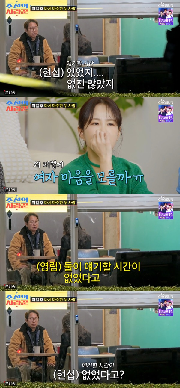 조선의사랑꾼/사진=TV조선조선의사랑꾼[스포츠투데이백지연기자]'조선의사랑꾼'심현섭이정영림에게미안한마음을전했다.6일밤방송된TV조선예능프로그램'조선의사랑꾼'에서심현섭이이별했다.이날방송에서심현섭은영림을만나"미안했다"고말했다.이에영림은"평소에조금잘하지"라고아쉬움을보였다.심현섭은"영림이가'동생들잘만나고오세요'했는데내가눈치가없었다.미안하다"고알렸다.영림은"자주볼시간이없었다.거의둘이얘기할시간이없었던거같다"고서운함을토로했다.이에심현섭은"있었다.없진않았다"고답했다.영림은"그게오빠기억과내기억이다른거같다"고말했다.심현섭은"앞으로는둘만있는시간을조금갖도록노력을하겠다"고사과했다.[스포츠투데이백지연기자[email protected]]Copyright©스포츠투데이.무단전재및재배포금지.