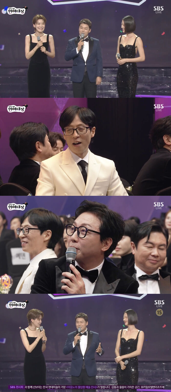 사진=SBS[스포츠투데이김태형기자]이상민이'2024SBS연예대상'에서2년연속SBS아들상을차지했다.29일서울마포구상암SBS프리즘타워에서'2024SBS연예대상'이열렸다.진행은전현무,이현이,장도연이맡았다.이날SBS아들상은총분량767분22초를기록한이상민이,SBS딸상은총분량228분5초를기록한이현이가거머쥐었다.SBS아들·딸상은지난한해동안가장많은분량을획득한예능인들에게주는상이다.특히이현이는3년연속SBS딸상을차지해눈길을끌었다.이현이는"3년연속SBS맏딸이현이다.올해는정말기대를안했는데또저다.진심으로몰랐다"며"올해도맏딸로선정이돼서감사하고제분량을많이뽑아주셔서감사하다"고인사했다.이어"열심히리액션하고출연하고뛰었던보람이느껴지는날이다.3년연속맏딸이면SBS에서도서류라도한장해주실법도한데한번끝나고말씀나눠보도록하겠다"며"작년에도이상민씨가맏아들로같이수상을했는데또오늘남매로같이수상하게돼서기쁘다"고전했다.다음으로2년연속SBS아들상을차지한이상민은"느낌이올해도(대상이)아닌가보다"라고말해웃음을자아냈다.이상민은"사실저에게는'아들상'이가장큰상이다.많은분들께저를보여드렸으니말이다.한때는1분도나오지못하고집에서항상TV만보던제가TV속에서많은분께저를많은시간보여드릴수있다는건그어떤것보다더큰행복이다.또2년연속받았다보니열심히하면매년받을수있는상이란건올해느꼈다.새해복많이받으시고저에게주신모든좋은기운덕분에걱정없이살게되는이자리까지오게됐다.제가받은사랑여러분께최선을다해돌려드리겠다"고전했다.[스포츠투데이김태형기자[email protected]]Copyright©스포츠투데이.무단전재및재배포금지.