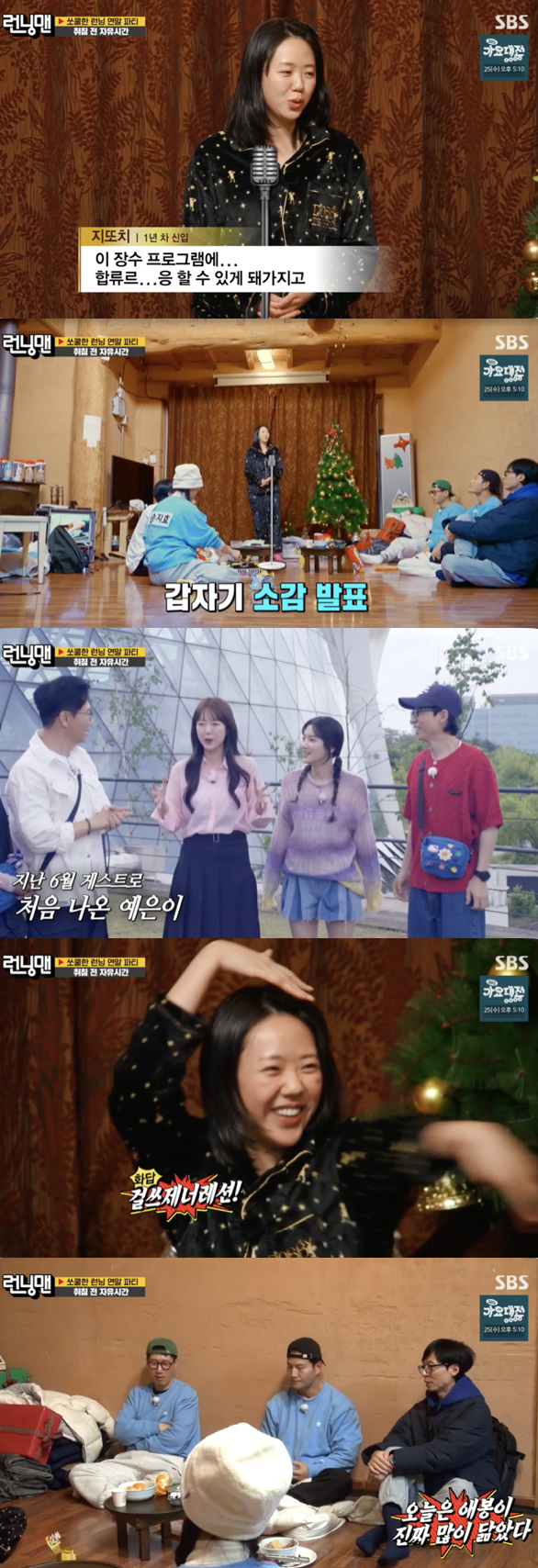 [스타뉴스|정은채기자]/사진='런닝맨'방송화면캡쳐지예은이'런닝맨'에공식합류하며신고식댄스를선보였다.22일방송된SBS'런닝맨'733회에서는밤이깊어질수록운명이달라지는'쏘쿨한런닝연말파티下'가공개됐다.이날멤버들은취침전노가리를먹으며휴식시간을가졌다.유재석은지예은이'런닝맨'에첫출연했던지난6월을언급하며"우리처럼오래된프로그램은팬들이멤버들의들고나옴에대해예민하다"라며지예은의고충을이해하는모습을보였다.이어김종국은"(지)예은이가우리한테와서너무잘했다"라며'런닝맨'에잘적응한지예은을칭찬했고,유재석역시"(지)예은이가우리프로그램에활력을넣어줬다"라고거들었다.그러나훈훈한분위기10초를가지못했다.하하는지예은에게"(합류했으니까)한턱쏴"라고했고,지석진은"(양)세찬이는(멤버들한테)1인당5만원씩월20만원을쏜다"라며하하의농담에합세했다.김종국역시"그러지말고우리한테출연료에서조금씩주면된다"라며거들었다.이어하하는런닝맨으로공식합류하게된지예은에게소감을말해보라요청했다.이에지예은은잠옷차림으로"이장수프로그램에제가합류할수있게돼서(기쁘다).제가연예인이돼가지고(누군가)'어디프로그램에나가고싶냐'라고물어보면'런닝맨!'(이라고말했었다"라고털어놨다.이를들은김종국이"(그런발언을했는데)왜기사가한줄도안났었냐"라고의심하자지예은은"제가안유명했어서"라고설명했다.마지막으로지예은은댄스신고식으로'런닝맨'합류각오를다졌다.그는학창시절에배운춤이라며소녀시대의'더보이즈'를선곡했다.직접라이브로노래를부르며춤을췄지만멤버들은"애봉이아니냐",'오늘은애봉이를진짜많이닮았다"라고지예은의무대에집중하지않고새별명을붙이며놀리기에바빴다.정은채기자[email protected]©스타뉴스&starnewskorea.com,무단전재및재배포금지