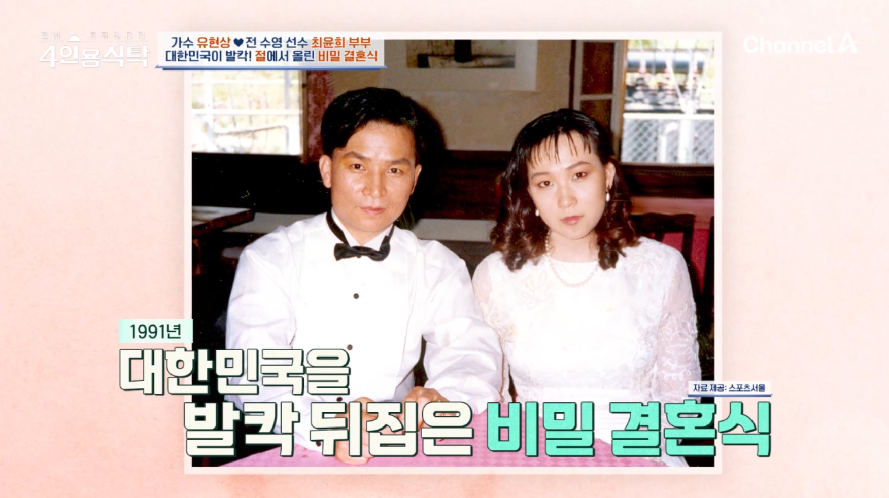 (엑스포츠뉴스윤현지기자)'4인용식탁'유현상과최윤희가비밀결혼과정에대해이야기했다.지난23일방송한채널A‘절친토큐멘터리–4인용식탁’에서는결혼34년차가수유현상과전수영선수최윤희부부가출연해결혼35년차김학래,임미숙부부를초대했다.전수영선수최윤희는1982년뉴델리아시안게임에서만15세에금메달3개를획득하고1986년서울아시안게임에서금메달2개를거머쥔'아시아의인어'.최윤희는"다섯살때부터수영을시작했고대학교1학년때은퇴했다.그때만해도할머니수영선수라고했다"라고설명했다.결혼전주위의반대를겪었다는유현상과최윤희.최윤희는"은퇴후방송일을했다.KBS방송국계단에서만났다.예전에는MBC와KBS밖에없었다.MBC에서방송일을하고KBS오면그많은사람중에유달리남편과자주마주쳤다.그후에사석에서봤는데낯도익어서금방친해졌다"라며첫만남을회상했다.유현상은처가의반대가심했다며"우리는결혼하고도(처가에서)인사를안받아줬다"라고털어놨다.최윤희는"내가자꾸늦게들어오니(엄마가)이상하니집앞에서기다리셨다.남편보고외출금지가됐다.그런데도잠깐문방구에뭐사러나간다고하고나가면남편과밥을먹고들어갔다.남편은날10분보러왔었다.그마음이변치않으면결혼하자했다"며애틋한마음에반했다고했다.결국두사람은1991년절에서비밀결혼식을올렸다.최윤희는"친분있는분과상의해서그분이준비를해줬다"라며말문을열었다.유현상은"우리는언제결혼하는지,장소가어딘지,하객이누군지,증인이누군지아무것도모르고결혼사진도없다.신문사기자가특종을내야하니까자기만찍은거다.누가결혼사진이필요하다고하면신문사에서사야한다"고말했다.그분들도결혼인지모르고왔다.굉장히난처해하셨다.증인이돼서싫으셨을거다"라고말했다.유현상은"아내에게미안한게예복을준비하지못하고면사포도씌어주지못했다"라며아쉬워했고,최윤희는"원피스같은드레스를입었다"고거들었다.유현상은"결혼식을하고인사를드리러어머니를찾아뵀다.'열심히살겠습니다'라고했는데등을돌리고계셨다.등에대고절하고인사하고왔다.윤희에게절대날데려오라고하지말라고하셨다.첫째아들을낳고마음을여셨다"라며힘들었던결혼과정을언급했다.이어이제는처가에서자신을인정했다고이야기하며"첫째아들낳고그때마음을좀열어주셨다"면서"물론지금은좋아해주신다.이자없이돈도빌려주실정도"라고너스레를떨었다.사진=채널A윤현지기자[email protected]©엑스포츠뉴스.무단전재및재배포금지.