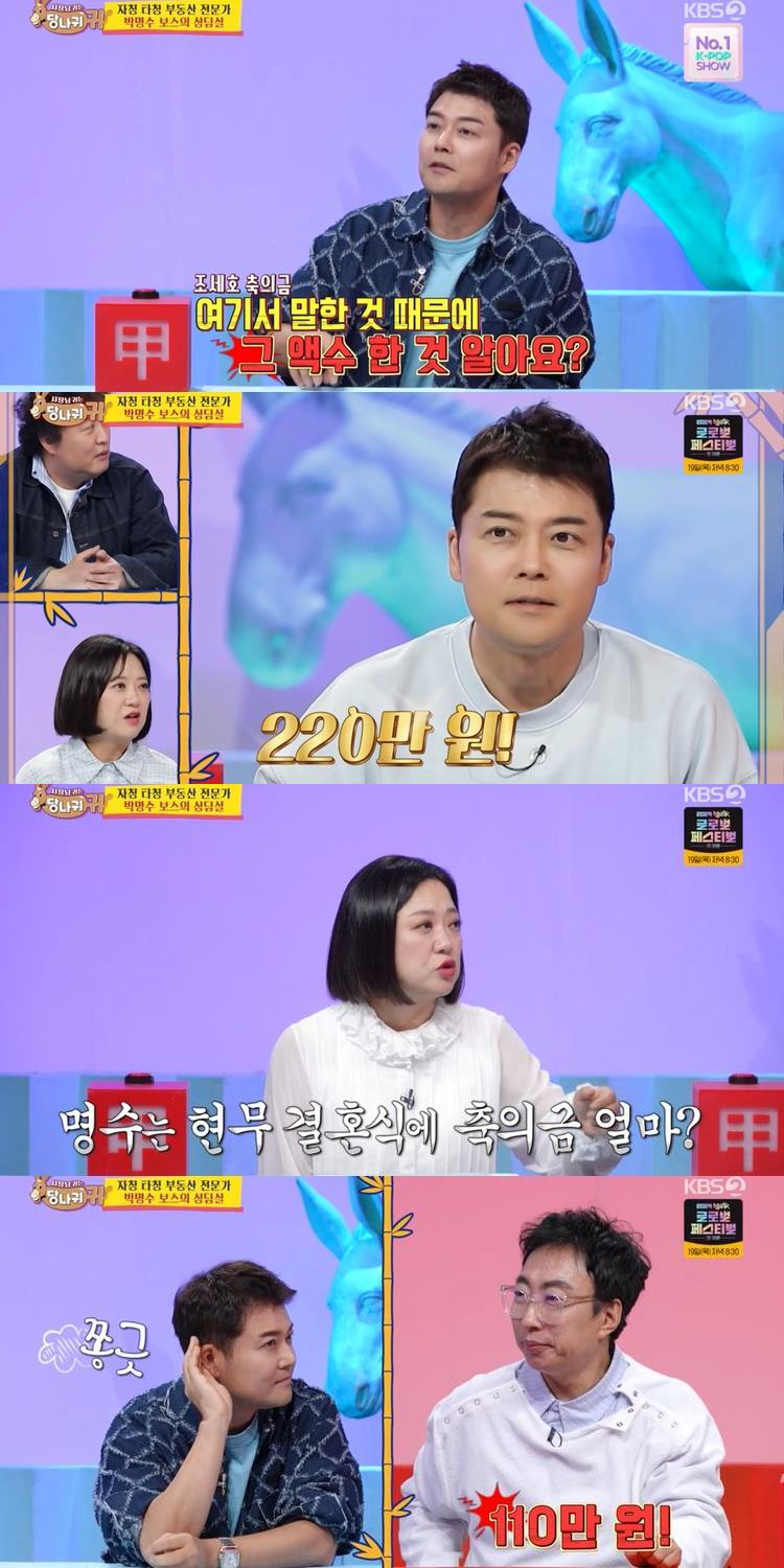 사진=KBS2‘사장님귀는당나귀귀’방송캡처.방송인전현무가조세호결혼식축의금에대해억울해했다.15일방송된KBS2‘사장님귀는당나귀귀’(이하‘사당귀’)에는박명수가자칭타칭부동산전문가로코미디언김경진과만났다.이날김경진은“요새방송없을때돌잔치,결혼식,칠순잔치등각종행사비로생활비를충당하고있다”라고근황을전했다.그러면서“왜제결혼식때오지않았냐?”고박명수에게기습질문을했다.당황한박명수는“그때무한도전할때라바빴다”고변명했지만,시기가겹치지않았다.또김경진결혼식으로50만원을줬다는박명수.그는“지금으로치면100만원이다”라며허세를떨었지만,김경진이“4년전인데요?”라고의문을제기하자,박명수는다시“65만원”이라고정정했다.심지어방송인조세호결혼식에는필참,축의금으로2배이상되는100만원을냈다는이야기에시무룩해진김경진.이를스튜디오에서지켜보던전현무역시“나도박명수씨가바람잡이해서조세호결혼식때220만원을냈다.원래는100이었다.220만원씩안한다”라고억울해했다.김숙이“박명수씨는전현무씨결혼할때얼마나낼거냐?”고묻자,박명수는“110만원이다.일꽂아주면200,두개꽂아주면300만원”이라며칼같이계산하는모습으로웃음을자아냈다.김지혜기자[email protected]©일간스포츠.무단전재및재배포금지.
