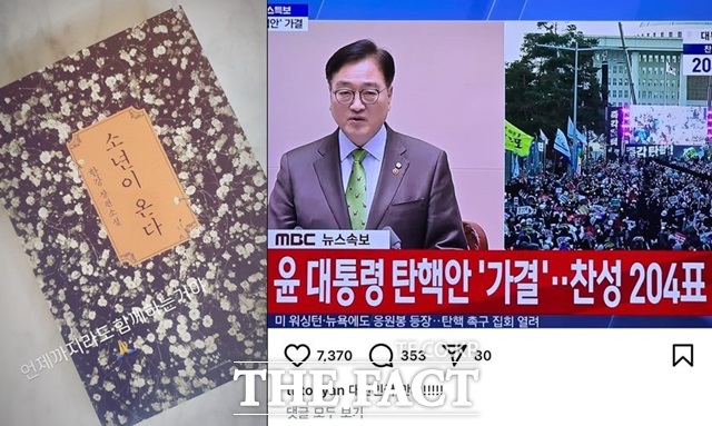 '대한민국만세'소회밝혀소녀시대서현,배우이동욱등다수의배우와가수들은탄핵소추안가결을기념해SNS를통해소회를밝히며환영했다./인스타그램캡처[더팩트ㅣ황지향기자]윤석열대통령의탄핵소추안이지난14일국회에서가결되자연예계에서도이를환영하는목소리가나오고있다.14일과15일다수의배우와가수들은탄핵소추안가결을기념해SNS를통해소회를밝혔다.배우이동욱은팬소통플랫폼에"봄이한발가까워진듯,따듯한연말이됐으면"이라고글을남겼다.배우고민시는자신의SNS에'탄핵소추안가결'이라고적힌뉴스화면과손뼉을치는이모티콘을함께게시했다.배우허성태도SNS에"웃으세요,기쁩니다,다시태어난것같아요.다시각자의자리에서뜨겁게행복합니다!대한국민만세!"라는글을,가수박효신은"지금그어떤말보다우리에게위로가될수있는오늘이되기를기도합니다"는글을각각올렸다.소녀시대멤버서현은한강작가의소설'소년이온다'표지사진과함께"언제까지도함께하는거야"라고적었다.해당문구는이번탄핵촉구집회에서시위곡으로사용된소녀시대데뷔곡'다시만난세계'의한구절이다.소년이온다는과거5·18민주화운동당시광주를그린소설이다.가수안예은은중계화면과함께"봄"이라는글을올렸고,가수토니안은가결소식을전하는뉴스화면과'대한민국만세'라는글을게시했다.일부는전날탄핵촉구집회를직접찾아힘을보태기도했다.박찬욱감독은국회인근베이커리에서만든빵을모두결제해한국영화감독조합과함께집회에참석한시민들에게나눠줬다.나눠준빵에는'윤석열과헤어질결심'등의문구가새겨진스티커가붙어있었다.가수이승환은집회무대에올라직접공연했다.이밖에도원더걸스출신핫펠트(예은),아이즈원출신이채연,배우한예리,신소율등이집회현장인증샷을남겼다[email protected]발로뛰는더팩트는24시간여러분의제보를기다립니다.▶카카오톡:'더팩트제보'검색▶이메일:[email protected]▶뉴스홈페이지:http://talk.tf.co.kr/bbs/report/writeCopyright©더팩트.무단전재및재배포금지.