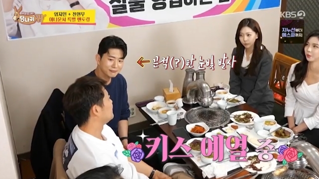 KBS2TV‘사장님귀는당나귀귀’캡처KBS2TV‘사장님귀는당나귀귀’캡처[뉴스엔서유나기자]아나운서출신방송인전현무가또다른후배아나운서와핑크빛분위기(?)를자아내며삼각관계를형성했다.12월15일방송된KBS2TV예능'사장님귀는당나귀귀'(이하'당나귀귀')285회에서는전현무와KBS아나운서후배들의만남이이어졌다.이날전현무는토크쇼진행잘하는팁을전수하기위해홍주연과인터뷰를하는척했다.전현무는앞서본인과열애설이터졌던홍주연에게"주연씨는이상형이뭐죠?"라고물었고이를보며MC들은"저건조금의미있는질문아닌가?","너요!"를외치며환호했다.전현무는"저질문하려고여태있었다"고너스레떨었다.홍주연은"귀여운남자가좋다"며구체적으로"전현무같은남자가좋다"고답했다.전현무는이에"받아들이겠습니다!"라고답변하는모습으로실제핑크빛을기대하게만들었다.그러던중박명수는전현무만바라보고있는옆자리의김진웅을포착하곤"진웅이는원래목이저런거냐"고물었다."키스하기전"이라고당시의부담감을드러낸전현무는박명수의"혼인신고하실거냐"는질문에"하는거봐서"라고장난스레답했다.김진웅은전현무에게무려커플티셔츠를선물하기까지했다.이런모습에김숙은"사랑의방향이다다르다.진웅이는현무를보고현무는주연이를보고"라며세사람을삼각관계로묶어웃음을자아냈다.뉴스엔서유나stranger77@기사제보및보도자료[email protected]ⓒ뉴스엔.무단전재&재배포금지Copyright©뉴스엔.무단전재및재배포금지.