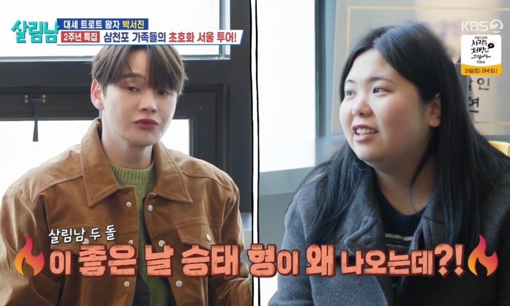KBS2TV‘살림하는남자들시즌2’KBS2TV‘살림하는남자들시즌2’[뉴스엔이슬기기자]박서진이신승태를견제했다.1월24일방송된KBS2TV'살림하는남자들시즌2'(이하'살림남')에는'살림남'출연2주년을맞은박서진이그려졌다.이날박서진은그동안고생한가족들을위한날을계획했다.가족들은설레여하면서도"오늘마지막방송이가""이제다른사람이나오는거냐"라며박서진을놀렸다.특히가족들은앞선방송에서'살림남'고정자리를노렸던신승태를언급해웃음을더했다.신승태는'살림남'지상렬편에출연,박서진을향해"2년정도하셨으면이제물러나시고"라고한바있다.이에박서진은"아니신승태형이지금왜나오냐.왜소금을뿌리는데"라고발끈했다.스튜디오에서도신승태에대한이야기가나왔다.결국박서진은"아무도못들어온다"라며경계심을드러내웃음을이끌었다.뉴스엔이슬기reeskk@기사제보및보도자료[email protected]ⓒ뉴스엔.무단전재&재배포금지Copyright©뉴스엔.무단전재및재배포금지.