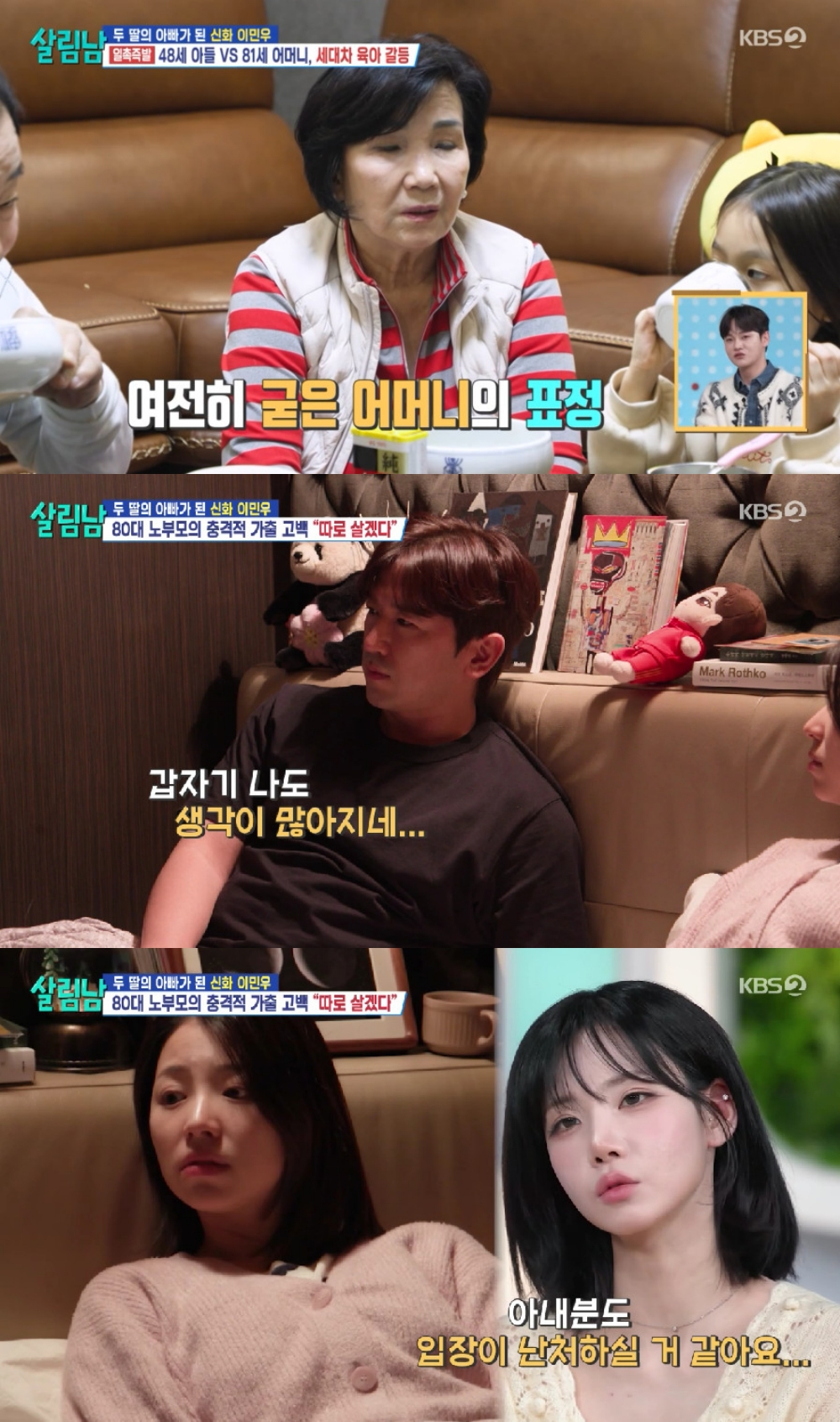 [스타뉴스|김나연기자]이민우/사진=KBS2TV살림남그룹신화이민우가둘째딸출산한달만에부모님과갈등이생겼다.24일방송된KBS2TV'살림하는남자들시즌2'(이하'살림남')에서는3대가함께살아가는이민우가족의일상속에서서로다른육아법에이민우와어머니가언쟁을벌인다.이날방송에서이민우의어머니는최근출산으로몸이지친며느리를위해특별한보양식까지준비했다.모유수유에좋다고알려진'돼지족탕'을끓였지만,며느리는충격적인당황스러움을감추지못했다.어머니는며느리에게계속해서돼지족탕을권했고,이민우는어머니에게"그만좀"이라며폭발하는모습을보였다.이에굳은표정을보인어머니는"우리집아저씨랑싸우면칼로물베기다.근데자식이뭐라고하면가슴에꽂힌다"고말했다.이민우부모님은거실에서잠이들었고,어머니는"이렇게같이살아야하냐.신경그만쓰고남원내려갔으면좋겠다"고했다.이민우의아버지또한"내가요즘정신적으로자식들에게잘하고있는건지판단이제대로안되고있고,솔직히결혼식하기전이라도내려가서집사람이랑있으면어떨까싶다"고전했다.이민우는"갑자기남원내려간다는소리하고계셔서쓸데없는소리하지말라고했다.갑자기나도생각이많아진다"며"부모님도시골에서지낼수있겠지만100%반대"라고말했다.어머니가치매초기진단을받았고,건망증이심해진상태이기때문.그는"어떻게해야할지고민된다"고말했다.한편이민우는지난해12월둘째딸을출산했다.이민우의아내는11살연하이아미로재일교포3세다.그녀는6세딸을둔싱글맘으로이민우는지난해두딸의아빠가됐다.이민우는오는3월결혼식을올릴예정이다.김나연기자[email protected]©스타뉴스&starnewskorea.com,무단전재및재배포금지