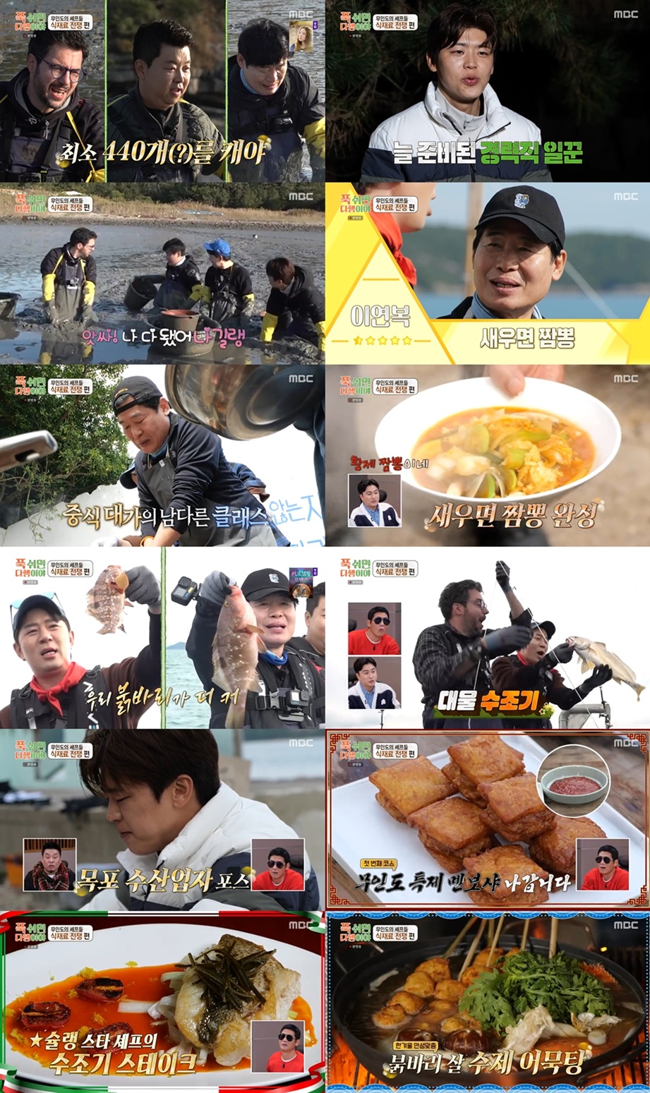 '푹쉬면다행이야'무(無)에서유(有)를만드는이연복의요리에시청자들도빠져들었다.iMBC연예뉴스사진지난1월6일방송된MBC예능프로그램'푹쉬면다행이야'(연출김명진,신현빈,이준범,김기호/작가권정희/이하'푹다행')30회는중식의신이연복,일식대가정호영,양식끝판왕파브리와0.5성급무인도임원붐,그리고트로트의황태자박지현이함께하는'무인도의셰프들'2편으로꾸며졌다.시청률조사기관닐슨코리아에따르면이날방송은전국기준5.4%의시청률을기록하며,월요일방송된모든예능프로그램중가장높은수치로월요예능최강자의위엄을보여줬다.이날붐과셰프들은0.5성급갯벌에서식재료를찾는사투를펼쳤다.갯벌에손을넣을때마다나오는참꼬막,모시조개등재료들에셰프들은흥분을감추지못했다.“본인요리에쓸건본인이잡아야한다”는붐의말에경쟁심을불태우는세사람의모습이웃음을자아내기도했다.여기에0.5성급무인도근처고흥유자축제에행사를하러왔다가,일꾼으로들린트로트의황태자박지현도합류해열기를더했다.이런가운데자신이요리할만큼조개를잡고“앗싸.나다잡았어.나먼저갈래”라며해맑게이야기하는이연복의유치한(?)한마디에모두가빵터졌다.붐은“그래도어른으로서의모습은지켜달라”며디스를했고,이를듣고이연복은급반성하며다시해루질에집중했다.박지현의노동요를들으며힘을내서해루질을한이들은푸짐한재료와함께0.5성급무인도로돌아왔다.전날잡은새우와갯벌에서잡아온조개까지,재료가푸짐해조식에대한기대감이더높아졌다.그러나붐은배고픈손님들을위해시간관계상조식메뉴를하나로통일하기로했다.파브리는'봉골레파스타'를정호영은'냉우동'을메뉴로선정하며각자의필살기를내세웠다.여기에질수없는이연복은'새우면짬뽕'이라는신메뉴를꺼내들었다.이메뉴는손님들은물론셰프들의호기심까지자극하며조식메뉴로뽑혔다.이연복은새우살을곱게다져이를이용해면을만들고,자신의노하우가더해진얼큰칼칼한짬뽕국물을만들어세상에없던요리'새우면짬뽕'을탄생시켰다.정호영과파브리는“너무신기하다”며놀라워했고,스튜디오에서이를보던안정환도“황제짬뽕”이라고감탄했다.손님들에게조식을대접한후이들은저녁식사를위해다시바다로나갔다.이들은붐,박지현,파브리팀과이연복,정호영팀으로나뉘어주낙조업을했다.서로다른팀배보다많이잡겠다는의지를가진두팀은경쟁하듯열심히낚싯줄을끌어올리며붉바리부터쏨뱅이,붕장어등다양한물고기들을잡았다.특히생선스테이크용큰생선을간절히원하던파브리는마지막에수조기대어를낚아“미라클”이라며환호했다.그렇게푸짐한재료와함께찾아온저녁시간,셰프들은첫째날메뉴순서로싸웠던것과달리이번에는오직손님들을위해한마음한뜻으로순서를정했다.이연복은“대한민국에서내멘보샤가최고”라는자부심으로'멘보샤'를,파브리는'생선스테이크'를,정호영은고급생선으로어묵을만들어'어묵탕'을만들기로했다.그중생선도,새우도없이멘보샤를만들겠다는이연복의요리과정이눈길을끌었다.그는새우를대신해꽃게와붉바리살로속을만들고,식빵대신감자로빵모양을만들어유일무이한멘보샤를창조했다.극한의환경에서도최고의요리를만드는이연복만의능력에모두가감탄할수밖에없었다.여기에미슐랭셰프파브리의특제소스가더해진'수조기스테이크'와세계최초붉바리로만든최고급'붉바리살수제어묵탕'까지,오직0.5성급무인도에서만먹을수있는요리의향연이시청자들의군침을자극했다.한편방송말미공개된예고편에는세계를제패한금빛검객오상욱이출연,무인도에서헤매는'쫄보검객'으로반전매력을선보여궁금증을자극했다.MBC'푹쉬면다행이야'는매주월요일밤9시방송된다.iMBC연예유정민|사진출처MBCCopyright©MBC연예.무단전재및재배포,AI학습금지.