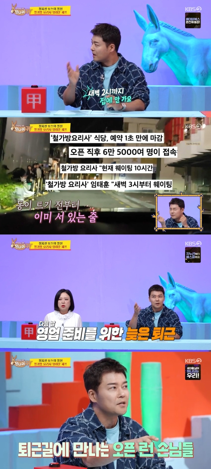 ‘사당귀’.사진lKBS철가방요리사임태훈셰프의바쁜일상이공개됐다.8일오후방송된KBS2예능프로그램‘사장님귀는당나귀귀’(이하‘사당귀’)에는철가방요리사임태훈셰프를찾아간정지선이모습을보였다.이날방송에서정지선과김희원셰프는철가방요리사임태훈셰프의매장에방문했다.정지선은“방송재미들였던데?손님은많이와?”라며근황을물었다.이에임태훈은“아니야.무슨재미를들여...주말에는새벽3시에오시는경우도있고”라며극구해명했다.전현무는“태훈이가영업시간이밤10시에끝나는데새벽2시까지집에안가요.다음날새벽4시에퇴근하잖아요?그러면오픈런하는사람을만나요.그분에게번호표를드리고집에가서자고아침10시에나와요”라고임태훈의바쁜일상을대신밝혀놀라움을자아냈다.‘사당귀’는매주일요일오후4시45분KBS2에서만날수있다.[서예지스타투데이객원기자]Copyright©스타투데이.무단전재,재배포및AI학습이용금지