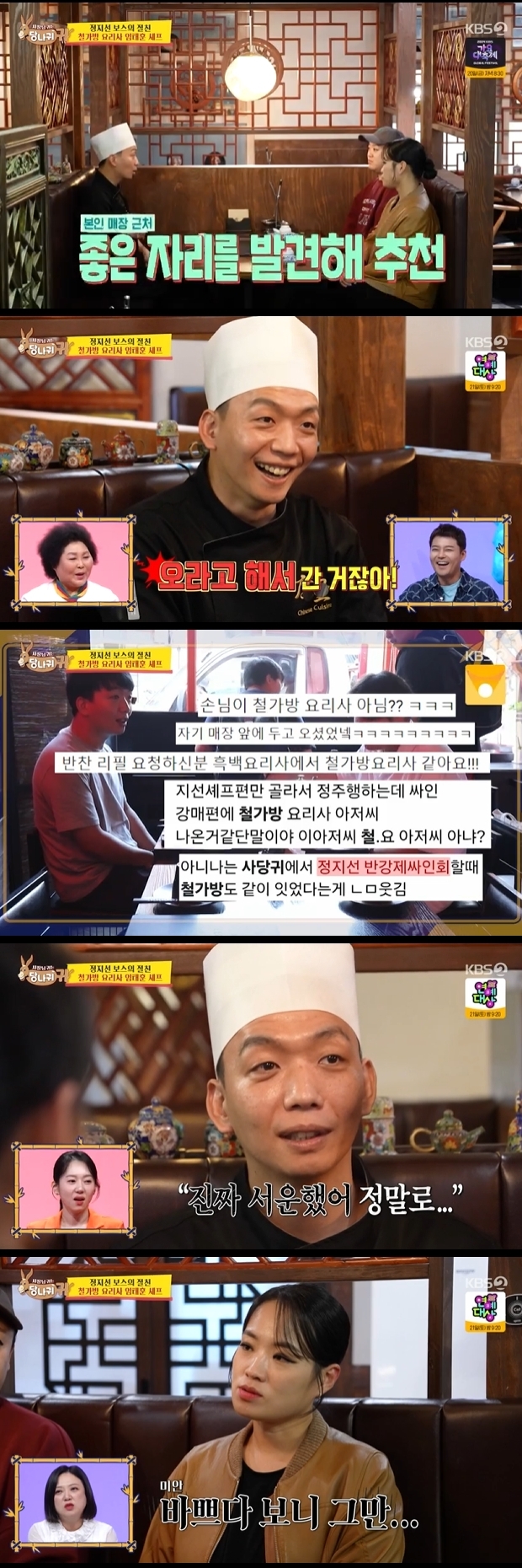 사장님귀는당나귀귀[티브이데일리김종은기자]'사장님귀는당나귀귀'임태훈셰프가정지선을향한서운함을토로했다.8일오후방송된KBS2예능프로그램'사장님귀는당나귀귀'(이하'사당귀')에서는임태훈셰프와정지선셰프가남매같은케미를자랑했다.이날정지선셰프는"내다음목표는중식계여자사단1호다.이젠새로운시대를열때다"라며누군가를찾았다.그주인공은바로최근넷플릭스'흑백요리사'를통해유명세를얻은'철가방요리사'임태훈셰프.정지선셰프는"사단멤버1호로태훈셰프를선정하러왔다"라고해시선을끌었다.자신의식당을찾은정셰프에임셰프는"누나요즘바쁘지않냐.어떻게왔냐"라고물었고,정지선이"조언을해주려왔다.갑자기스타셰프가됐는데실감이나냐.요즘방송에재미들인것같더라.손님들많이오지?"라고하자"엄청많이온다.주말같은경우엔새벽3시부터웨이팅을하시는분들도있다.대만,홍콩,인도네시아에서도오신다"라고해놀라움을자아냈다.이어임태훈셰프는정지선셰프와의특별한인연에대해들려주기도했다.그는"누나가가게를처음오픈한다고해서도움을주고싶었는데,마침서촌에좋은자리가나서소개해줬다.또1호점오픈뒤엔한번가기도했다.팬사인회한다고오라고해서한번가지않았냐"라고밝히며"그땐누나랑연락이잘됐는데어느순간부터연락이안됐다.'사당귀'에서화제를모은다음부턴연락이잘안됐다.그때진짜서운했다"라고했고,정지선셰프는"바빠서그랬다"라고사과하면서도"요즘은오히려쟤가전화를안받는다"라고해MC들을폭소케했다.[티브이데일리김종은기자[email protected]/사진=KBS2'사당귀']사장님귀는당나귀귀[Copyrightⓒ*세계속에新한류를*연예전문온라인미디어티브이데일리(www.tvdaily.co.kr)/무단전재및재배포금지]Copyright©티브이데일리.무단전재및재배포금지.