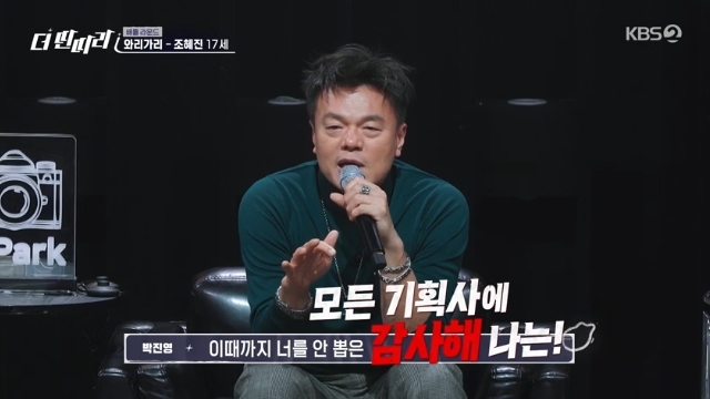 KBS2TV‘더딴따라’캡처KBS2TV‘더딴따라’캡처[뉴스엔서유나기자]JYP대표프로듀서박진영이한참가자의반전답변에당황했다.12월8일방송된KBS2TV예능'더딴따라'6회에서는한명은탈락하는1대1데스매치의3라운드가진행됐다.이날조혜진은혁오'와리가리'에맞춰댄스무대를선보였다.지금이무대에서기까지의내용을담았다는조혜진은소품하나하나에도의미를담았다고설명했다.조혜진의무대가끝나고마스터들은호평을쏟아냈다.차태현은"혜진이는배우다.꼭배우를했으면좋겠다.대사이런것도중요하지만배우가가져야하는모든걸갖췄다"고평했고,김하늘은"표정부터다르다.완전열렸다"며놀란심경을드러냈다.영케이는"시작하자마자부터소름이돋고시작해돋은상태로끝났다"며"무대하는순간순간너무나빛이나보였고아름다웠다.반드시살면서무대에설일이많았으면좋겠다.꿈을펼칠수있는삶을살았으면좋겠다"고응원을보냈다.가장마지막으로"제가흥분을잘한다.내가하려는말을곱씹어봤다"고운을뗀박진영은"'K팝스타'6년,'더딴따라'한것중이렇게온몸을바늘로찌르는것같은무대는처음이다.한포인트가그런게아니라계속충격에충격에충격에.머리쪽지고갑자기사작할때부터태가현대무용가로바뀌어있다.근데중간에뒷박을타고.계산한게아니라막나오는거다"라며"이때까지너를안뽑은모든기획사에감사한다"고말했다.이에조혜진은"(안뽑은기획사중)JYP도있었…"이라며말끝을흐려오디션장을초토화시켰다.당황한박진영은"그래서더연습을했나보다,그치?이렇게만난걸너무.지금이순간이렇게만난거안뽑아서이렇게된거다.너무감동이었다"고너스레떨었다.한편아이유는JYP가놓친스타로유명하다.과거KBS2TV'연예가중계'에출연한박진영은"아이유를볼때마다가슴이아프다.눈이마주칠때마다다른곳을본다"고아쉬움과미안함을토로한바있다.뉴스엔서유나stranger77@기사제보및보도자료[email protected]ⓒ뉴스엔.무단전재&재배포금지Copyright©뉴스엔.무단전재및재배포금지.