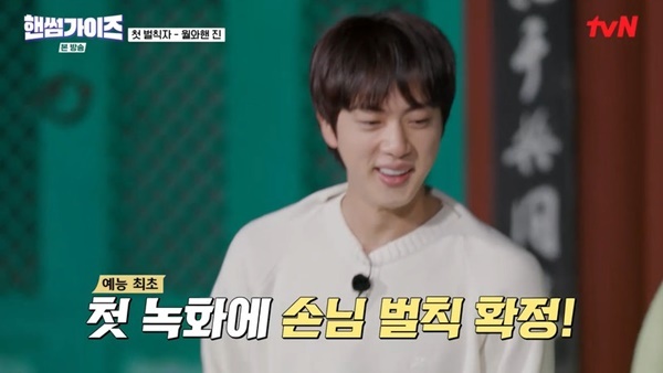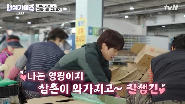 tvN‘핸썸가이즈’캡처tvN‘핸썸가이즈’캡처BTS진이고등어400마리포장벌칙을수행했다.12월8일방송된tvN‘일요일엔핸썸가이즈’에서는첫벌칙당첨자로첫게스트BTS진이당첨됐다.이날방송에서는핸썸즈팀이이경,오상욱,진이빙고게임에서패하며아귀잡이벌칙을수행하게됐다.제작진은아귀잡이배가작아퀴즈를통해최후벌칙자를정하기로했고,오상욱과이이경이냉큼퀴즈를맞히며진이벌칙에당첨됐다.실상본게임에서가장많이활약한진이막판퀴즈에서삐끗하며벌칙까지수행하게된상황.진은아귀잡이준비를하고바다로나갔지만풍랑주의보로배가뜨지못했고이에제작진이준비한또다른벌칙은고등어400마리포장하기였다.진은“이렇게많은고등어처음보는것같다”며탄식했고제작진은“고등어를포장해서상자에넣고퇴근하면된다.베테랑어머님들이도와주실거”라고말했다.진은“고등어쌓인게내집보다크다”고놀랐다.진은넉살좋게이모님들에게방법을물어보고“내가들고갈게요.안힘들어요.내가할게요.어머님쉬고있어요”라며배려했다.또진이“저때문에일처리가느껴지는거아니죠?”라고묻자이모님은“난영광이다.잘생긴삼촌이와서”라고반색했다.진은“잘생긴애랑하니기분좋죠”라며너스레를떨었고,곧빨라진작업속도로일을마무리했다.그렇게벌칙을모두수행한진은벌칙에서탈출한같은팀이이경,오상욱에게분노하며복수전을기약해재출연에기대감을더했다.(사진=tvN‘핸썸가이즈’캡처)[뉴스엔유경상기자]뉴스엔유경상yooks@기사제보및보도자료[email protected]ⓒ뉴스엔.무단전재&재배포금지Copyright©뉴스엔.무단전재및재배포금지.