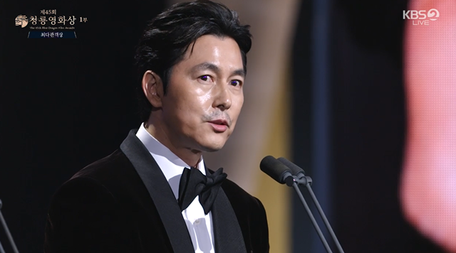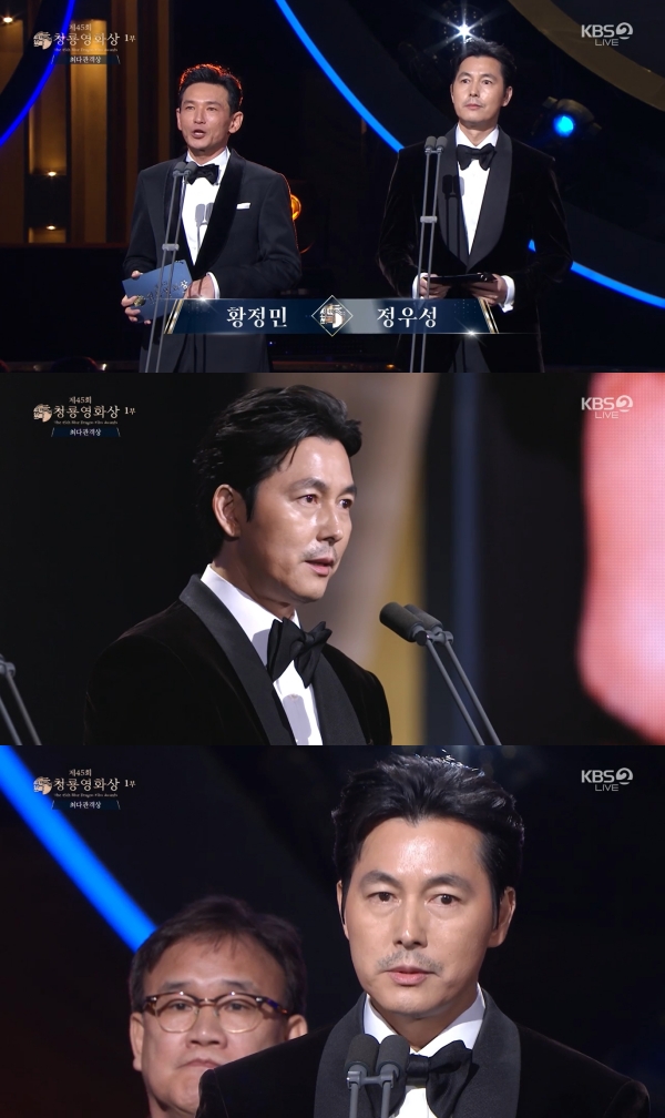 혼외자논란휩싸인정우성"염려와실망안겨드려죄송"정우성이제45회청룡영화상의무대위에올랐다.KBS2캡처배우정우성이제45회청룡영화상의무대위에올랐다.29일서울영등포구여의도KBS홀에서는제45회청룡영화상이개최됐다.한지민과이제훈이시상식MC로호흡을맞췄다.이날정우성과황정민은최다관객상의시상자로나섰다.두사람은'서울의봄'에서주연을맡아호흡을맞춘바있다.'서울의봄'은1,312만관객을동원하며뜨거운사랑을받았던작품이다.밝게웃는황정민과달리정우성은굳은표정을지어보였다.정우성과황정민이제45회청룡영화상에서최다관객상시상자로나섰다.KBS2캡처'서울의봄'은최다관객상트로피의주인으로호명됐다.무대에오른김성수감독은"그동안이상을받는분들이제일부러웠다.이상은관객분들이주시는귀한상이다.'서울의봄'을열심히만든제작진을대신해관객분들에게깊은감사를드린다"고말했다.황정민역시관객에게고마운마음을표현했다.정우성은자신의사생활논란을언급했다.그는"'서울의봄'을관람해주신모든관객분들께진심으로감사드린다.저는제사적인일이영화에오점으로남지않길바라는마음으로오늘이자리에섰다"고말했다.또한"제게사랑과기대를보내주셨던모든분들에게염려와실망을안겨드린점진심으로죄송하다고말씀드린다.모든질책은내가안고가겠다.아버지로서아들에대한책임은끝까지다할것이다"라고밝혔다.최근정우성은혼외자논란에휩싸인바있다.모델문가비가개인SNS를통해출산소식을전했는데,이후그가낳은아들의친부가정우성이라는소식이전해졌다.아티스트컴퍼니측은"문가비가SNS를통해공개한아이는정우성의친자가맞다"면서"아이의양육방식에대해최선의방향으로논의중에있으며아버지로서아이에대해끝까지책임을다할것"이라고말한바있다.정한별기자[email protected]©한국일보.무단전재및재배포금지.