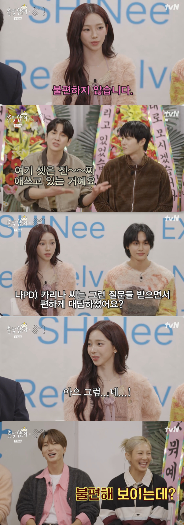 [스타뉴스|정은채기자]/사진='출장십오야'방송화면캡쳐'출장십오야'에스파카리나가표정과상반된답을내놨다.29일방송된tvN'출장십오야'에서는H.O.T.강타를시작으로동방신기최강창민,슈퍼주니어이특,소녀시대효연,샤이니키,EXO수호,레드벨벳슬기,NCT도영,에스파카리나,라이즈원빈까지,시대를아우르는SM엔터테인먼트아티스트총10인이대표로등장해치열한게임을펼쳤다.이날나영석PD는촬영전비하인드를전하며"대기실내려갔는데진짜웃긴게뭔지알아?이렇게셋(강타,최강창민,이특)이만있더라"라고폭로했다.이에강타는"후배들이불편할까봐피해주는입장에서"라고해명했고,이특은"사실효연도우리쪽이다"라며효연을자신들과같은세대로엮고자했다.이에나영석PD는"(효연은)놀랍게도저쪽(3세대,4세대,5세대멤버들이있는곳)에가계시더라"라고했고,효연은"중간사이에딱꼈죠"라고답했다.그러자키는"여기셋(효연,키,수호)은진짜애쓰고있는중이다.(4세대,5세대들에게)'뭐하고왔니?','어제는뭐했니?'(라고부담을안고질문해야한다)"라며제일어려운건'낀세대'라고주장했다"이를들은나영석PD가카리나에게"카리나씨는그런질문들받으면서편하게대답했어요?"라고묻자카리나는"아으..어..네"라며답을버벅여해보는이들의웃음을자아냈다.나영석PD가재차"불편한거전혀없어요?"라고묻자그는"불편하지않습니다"라고답하며선배들을안심시켰다.정은채기자[email protected]©스타뉴스&starnewskorea.com,무단전재및재배포금지