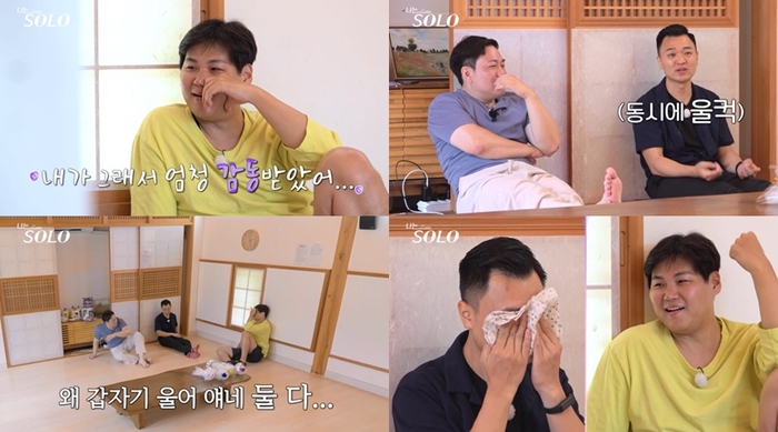 ‘나는솔로’.방송캡처‘나는SOLO(나는솔로)’23기영호와광수가‘솔로나라23번지’를‘오열의바다’로만든다.4일(오늘)밤10시30분방송하는ENA와SBSPlus의리얼데이팅프로그램‘나는SOLO’에서는영호-광수가릴레이로눈물을쏟는초특급반전이그려진다.앞서‘특대형F(MBTI감성형)인간’광수는‘1픽’옥순앞에서2번이나눈물을쏟으며‘눈물보이(BOY)’에등극한바있다.당시그는‘0표’를받아각성한뒤옥순과데이트를했는데,갑자기감정이북받쳐두차례나눈물을쏟았다.그런데이날광수는남자숙소에서영호와대화를나누던중‘곰남’영호의말에또다시울컥해눈물을쏟고야만다.오열사태의시작은광수가“난다시태어나면S대를가고싶어”라고‘S대출신’인영호에게물으면서부터다.영호가“왜?”라고광수의속마음을궁금해하자,광수는P공대출신으로‘엘리트코스’를밟아왔지만누구에게도밝히지못했던자신의고민을솔직하게고백한다.이를들은영호는광수의마음을이해해주면서도그를‘리스펙’하는자신의마음을전해광수를뭉클하게만든다.급기야영호는광수에대한이야기를하다가,“그래서엄청감동받았어”라면서눈물을쏟는다.갑작스런영호의눈물에광수역시흐느끼며울컥한감정을쏟아낸다.‘눈물배틀’을벌이는듯한두사람의모습에송해나는“이남자들어쩌면좋냐?”며당황스러워한다.상철역시영호-광수의릴레이오열에“왜갑자기울어?얘네둘다미치겠네!”라고난감해한다.잠시후영호는광수의손수건까지빌려눈물을닦은뒤,“나원래눈물잘안흘린단말이야”라고해명한다.이후로도두사람은광수의손수건을돌려쓰면서눈물을닦아‘한손수건두남자’상황을연출한다.데프콘은이들의모습에점차동화되더니,“나도눈물날라그래”라면서눈가를닦아내는포즈를취한다.‘솔로나라23번지’를갑자기눈물바다로만든두남자의‘오열사태’전말에초미의관심이쏠린다.영호-광수의릴레이오열이유는4일(오늘)밤10시30분ENA와SBSPlus에서방송하는‘나는SOLO’에서확인할수있다.서형우온라인기자[email protected]©스포츠경향.무단전재및재배포금지.