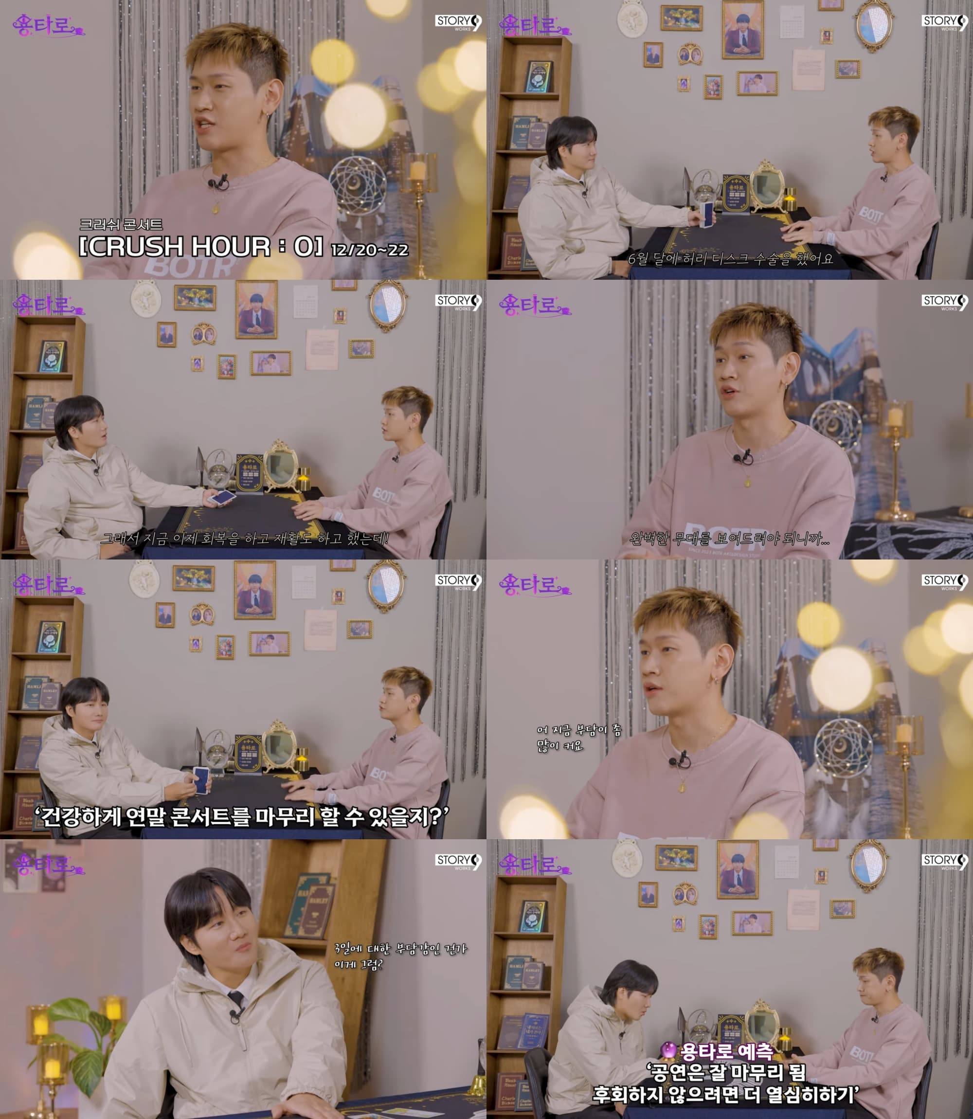 크러쉬가3일간열리는연말공연을앞둔무게감을털어놨다.iMBC연예뉴스사진크러쉬가4일공개되는유튜브채널‘용타로’에출연해“(녹화일기준)콘서트가한달남았는데,무사히마칠수있을지고민이다”라고털어놨다.크러쉬는12월20일부터22일까지3일간올림픽공원KSPO돔에서‘크러쉬아워:0(CRUSHHOUR:0)’라는타이틀로연말공연을준비중이다.크러쉬는“허리디스크수술을하고회복후재활까지마쳤지만,몸을많이쓸수밖에없는자리고,완벽한무대를보여줘야하니건강하게온전하게마무리할수있을지고민이많다”며“부담이있다.잘보여주고싶은마음”이라고말했다.크러쉬는지난6월허리디스크가급격히악화돼모든활동을중단하고수술을받았다.약4개월간치료와재활후공연준비에돌입했으며,12월연말공연으로음악활동을재개한다.이용진은“한번에1만관객을채울수있는뮤지션도몇명되지않는데,그공연장에서3일을하니부담이될수밖에없을것같다”며크러쉬가뽑은타로카드를읽기시작했다.이용진은“잘마무리될걸로나오고,후회하지않으려면열심히해야할것같다”며콘서트때마다비가오던크러쉬에게“공연날눈이내릴것같다”고예측했다.이날크러쉬는반려견두유와로즈의속마음,소속사대표이자선배가수인싸이가자신을어떻게생각하는지,앞으로의금전운,매니저가자신을어떻게생각하는지,브루노마스와함께작업을할수있을지등평소궁금했던다양한질문들을이용진에게쏟아냈다.또허리디스크수술과재활과정도솔직하게들려줬다.iMBC연예백승훈|사진출처용타로유튜브Copyright©MBC연예.무단전재및재배포,AI학습금지.