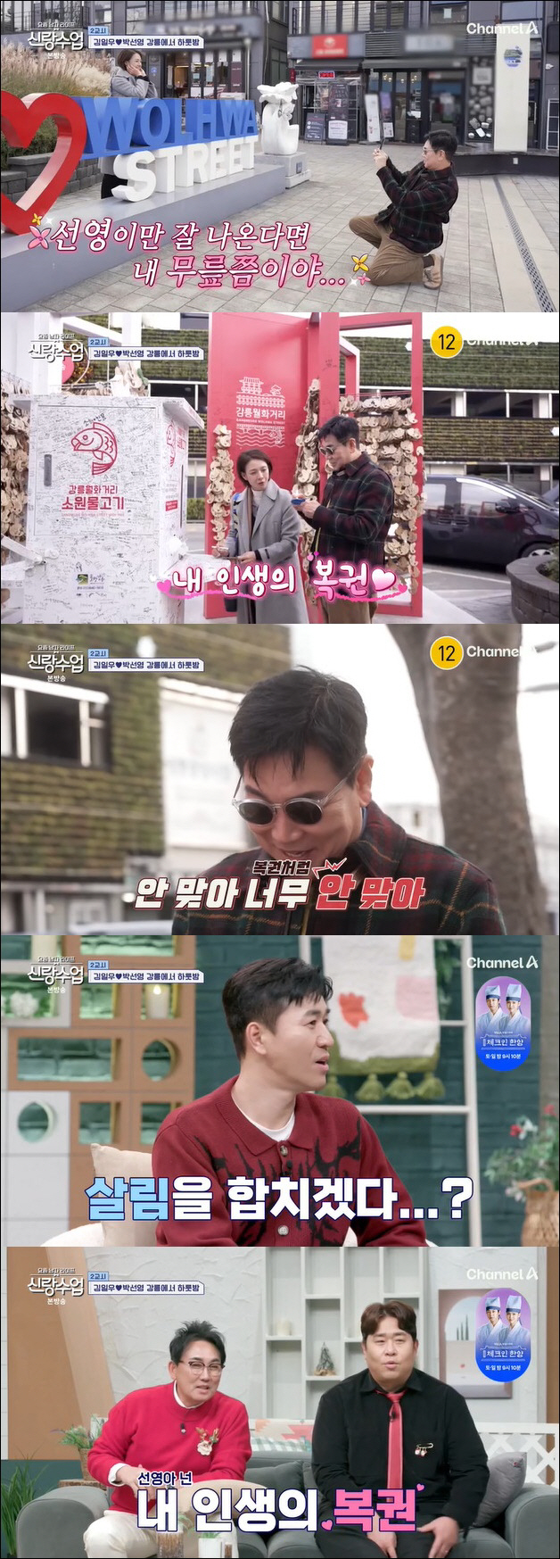 스포츠조선닷컴이우주기자]'신랑수업'김일우와박선영이쌍방플러팅으로핑크빛분위기를자아냈다.25일방송된채널A예능프로그램'신랑수업'에서는강릉에서하룻밤을보낸김일우와박선영의모습이담겼다.강릉에서만나데이트를시작한두사람.문세윤은"데이트를위해답사를갔다더라"라고물었고김일우는"어디가면좋을까왔다갔다했다"고밝혀모두를놀라게했다.월화거리로간두사람은'소원물고기'에서각자소원을적기로했다.복권당첨소원이야기가나오자김일우는"내인생에로또"라고박선영에거침없이플러팅멘트를날렸다.이에박선영은"오빠많이늘었다"고감탄했지만김일우는"안맞아.너무안맞아"라고농담해패널들의야유를자아냈다.그러나박선영은"만약1등당첨이되면오빠가말한주택을공동명의로사자"고말해모두를놀라게했다.김종민은"이건살림을합친다는거아니냐"고했고이승철도"삼대가덕을쌓아야된다는공동명의플러팅"이라놀랐다.문세윤은"내인생에로또를받고공동명의로받아친다"고감탄했다.박선영은"공동명의로사서1층에카페를하든지하자"고얘기했고김일우는"좋지"라고행복한미소를지었다.끊임없이대화하며시장으로간두사람.시장상인은두사람을보고"부부시냐"고물었다.이에또한번행복한웃음이터진김일우는"그렇게보이냐"고흐뭇해했다.김일우는"제가봐도선영씨랑같이서있을때부부라고오해할만도하다싶은생각이들더라"라고밝혔다.김일우가준비한데이트코스는바다앞글램핑장.김일우는"선영씨가바다도보고싶고캠핑도한번도해본적이없다더라"라며박선영을위해사전답사까지한곳이라밝혔다.박선영은김일우를위해선글라스를선물했고김일우는바로선글라스를껴바다로향했다.눈이잘안보인다는핑계로김일우는박선영에팔짱을끼려했지만박선영은김일우의팔을빼손을잡으며초고속직진을했다.사이좋게바닷가산책에나선두사람.오붓한데이트후김일우는"혼자보단둘이좋다.혼자가면고민이많아보이지않냐.근데둘이걸으니좋더라"라고행복해했다[email protected]©스포츠조선.무단전재및재배포금지.