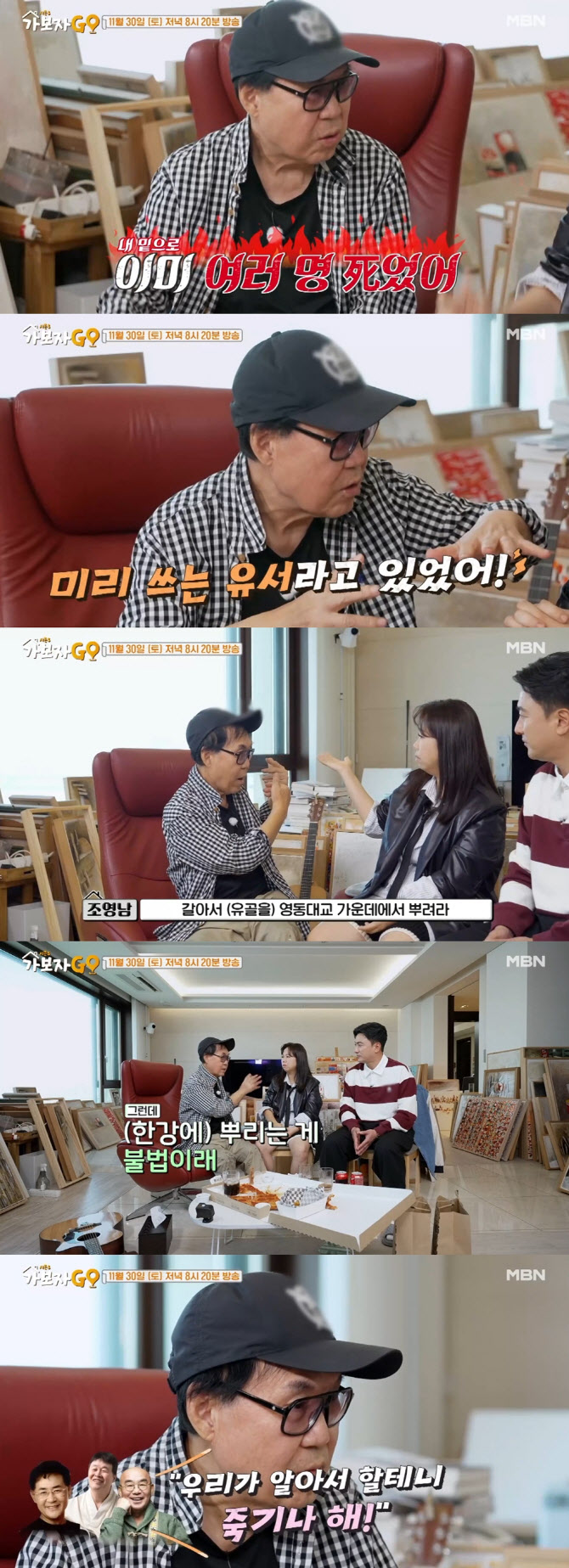 (사진=MBN‘가보자GO’시즌2)[이데일리스타in윤기백기자]가수조영남이재산분할내용이담긴유서내용을언급해화제다.오는30일방송예정인MBN리얼버라이어티‘가보자GO’시즌311회선공개영상에서는가수조영남이등장해유쾌하고파격적인유서를깜짝공개하며눈길을사로잡았다.MC안정환과홍현희는아이처럼해맑게손님맞이에나선조영남의모습에감탄했고,조영남은“곧80살이다.건강은신이내리는거다.내밑에있는애들여러명죽었어”라며아찔한농담을건네모두를놀라게했다.또한조영남은“미리쓰는유서가있어서썼다”라고밝히며,“유서에‘장례식을치르지말라.내가죽으면옆에있던사람이담요에말아서화장해달라.그리고내유골을영동대교가운데에뿌려달라’라고썼다”라고밝혔다.이어조영남은“그런데영동대교에뿌리는게불법이더라.그래서다음에유서를쓰게되면‘영동대교에뿌려달라’라고쓴뒤괄호를치고‘몰래’라고쓰려고한다”라며유쾌하게말해모두에게웃음을안겼다.조영남다운유쾌한유서내용을들은MC들은“유서에재산관련된내용도써야하지않나,뭐라고썼나?”라고물었고,조영남은“처음쓸때는‘내옆에있는여자에게재산의절반을줘라’라고썼는데수정했다.지금은자식이셋이니까3/4은자식,1/4은옆에있는여자다”라며시원하게답해이목을집중시켰다.연예인부터셀럽,화제의인물등그동안만나고싶었던친구들이있는곳이라면전국방방곡곡어디든달려가그들의인생이야기를듣고진정한친구가되겠다는기획의도를담고있는MBN리얼버라이어티‘가보자GO’시즌3는30일오후8시20분에방송된다.윤기백([email protected])Copyright©이데일리.무단전재및재배포금지.